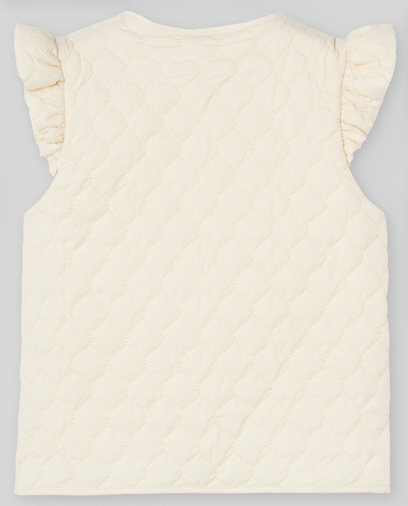 Chaleco acolchado en tono crudo con lazos decorativos en el delantero y volantes en los hombros. Una prenda ligera y abrigada ideal para superponer sobre vestidos o camisetas, añadiendo un toque coqueto a cualquier conjunto