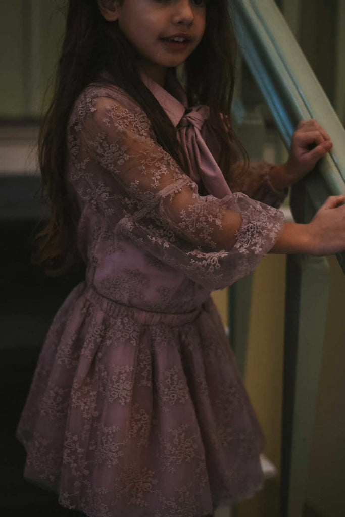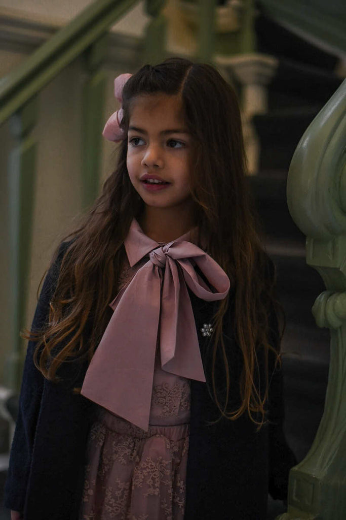 Un set de Falda y blisa de niña alegre en bordado suave, con botones de lazo dorados y un delicado cuello de encaje. La falda plisada le da al diseño una silueta clásica con un acabado lujoso. Perfecto para ocasiones festivas o para un elegante día de invierno.