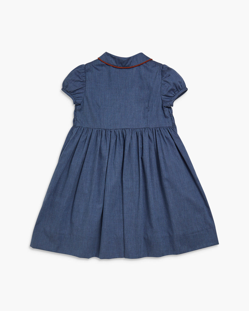 Viste a tu pequeña con una elegancia atemporal con este encantador vestido de chambray. Luce un encantador cuello Peter Pan ribeteado con pana naranja brillante para darle un toque divertido a un look clásico. Las mangas cortas abullonadas y la falda con forro completo ofrecen comodidad y estilo. El corpiño fruncido a mano añade un toque de magia artesanal, mientras que los botones de pana naranja en la parte delantera aportan un alegre toque de color. Este precioso vestido está hecho para lucirse en ocasiones especiales, combinando el encanto vintage con un toque moderno y divertido.
