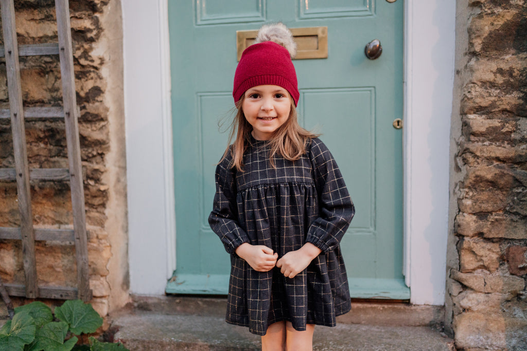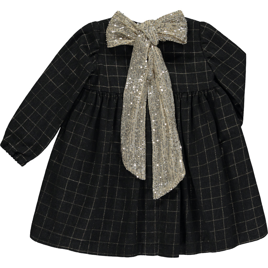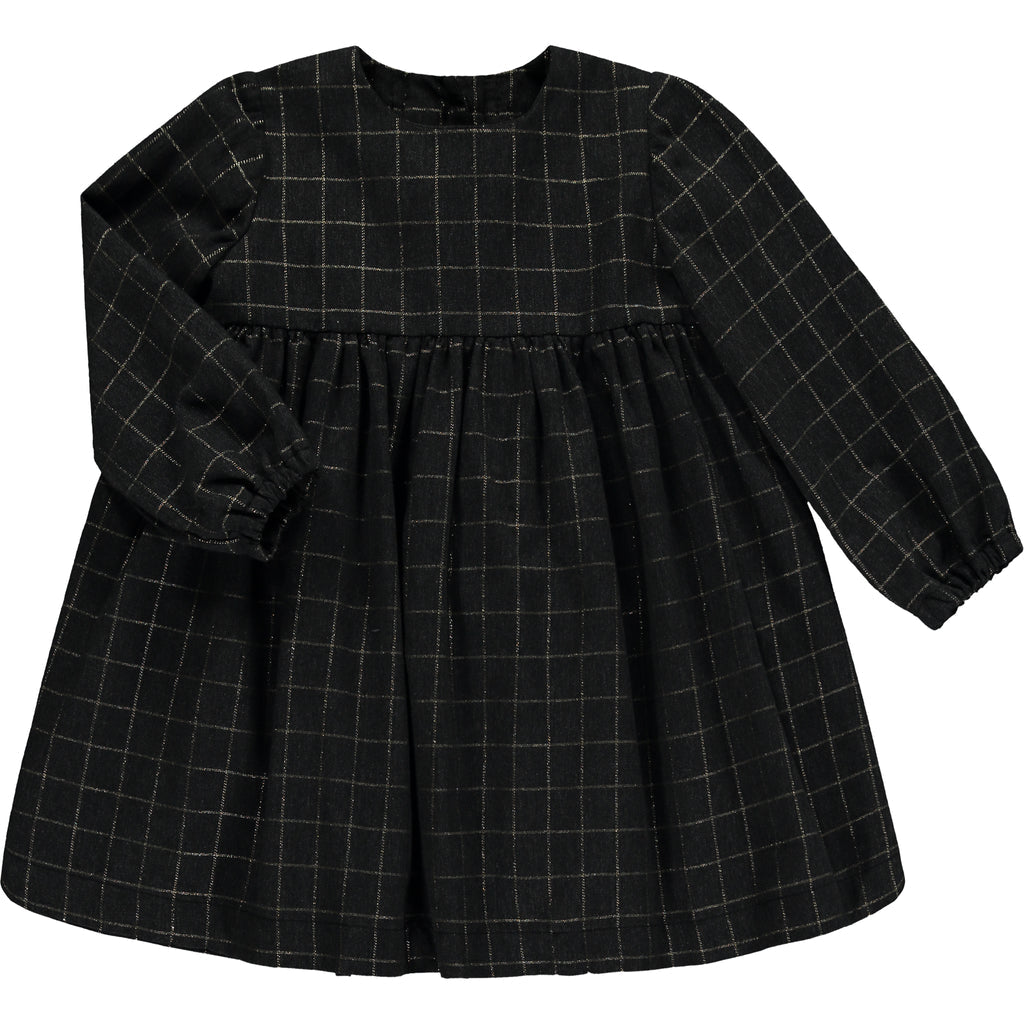 Un elegante vestido en color gris oscuro con discreto estampado de cuadros color champán.