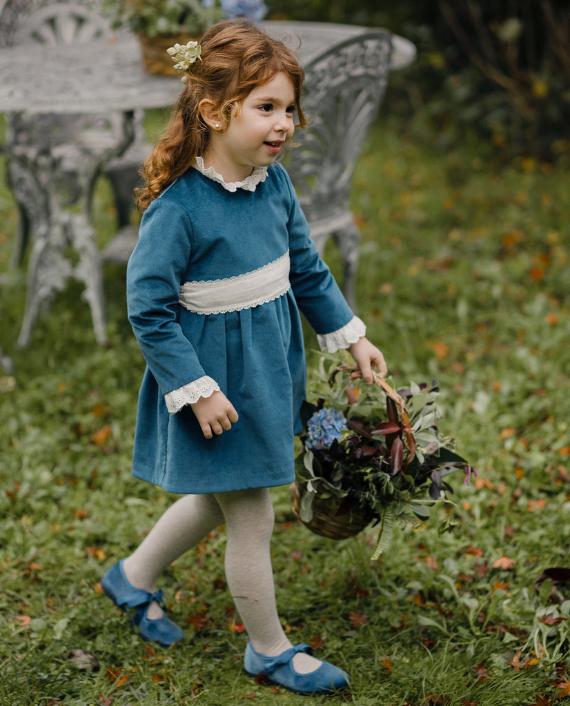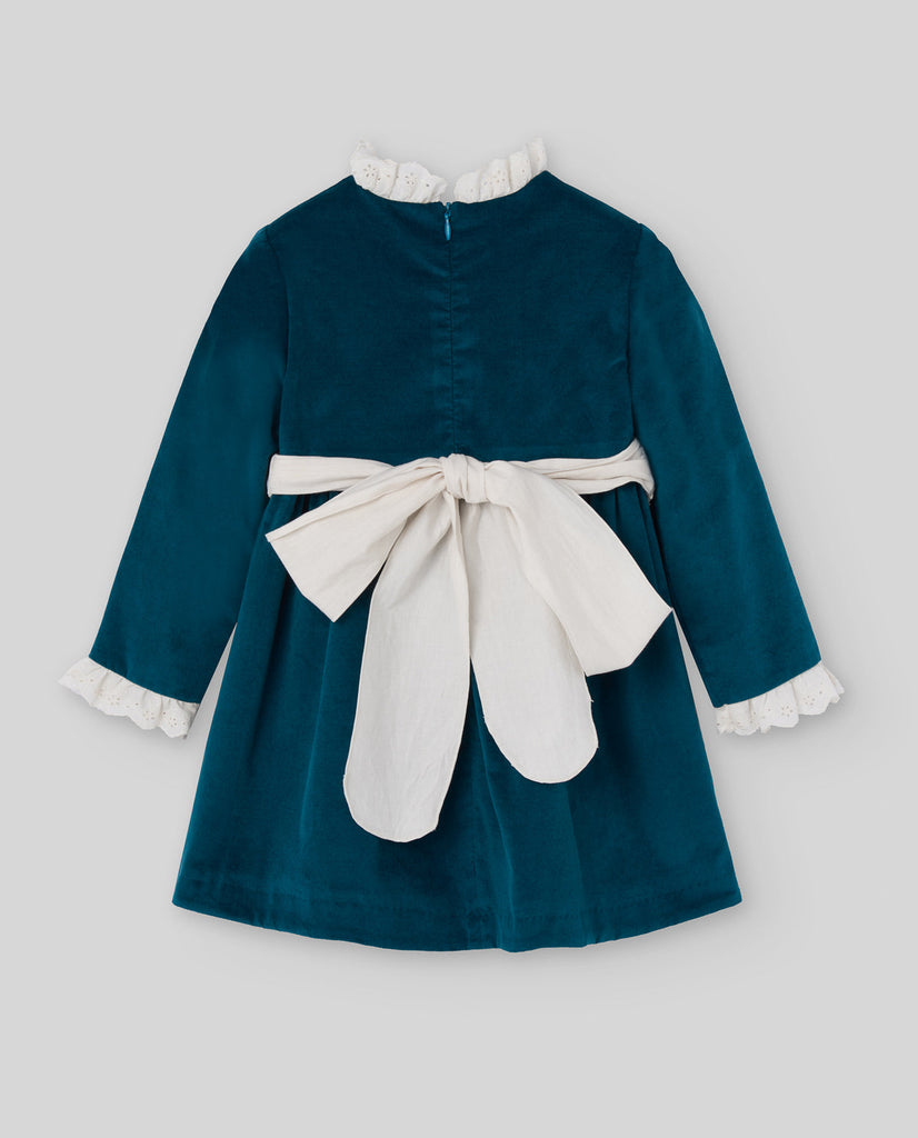 Vestido de ceremonia en velvetón con detalle de puntilla en cintura y cuello. Manga larga con frunce y falda con vuelo. Cierre trasero.