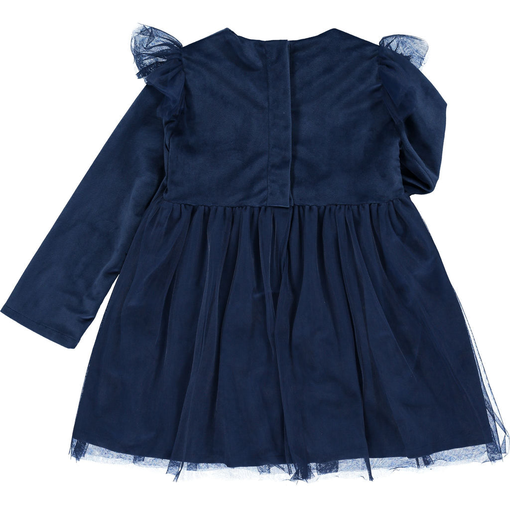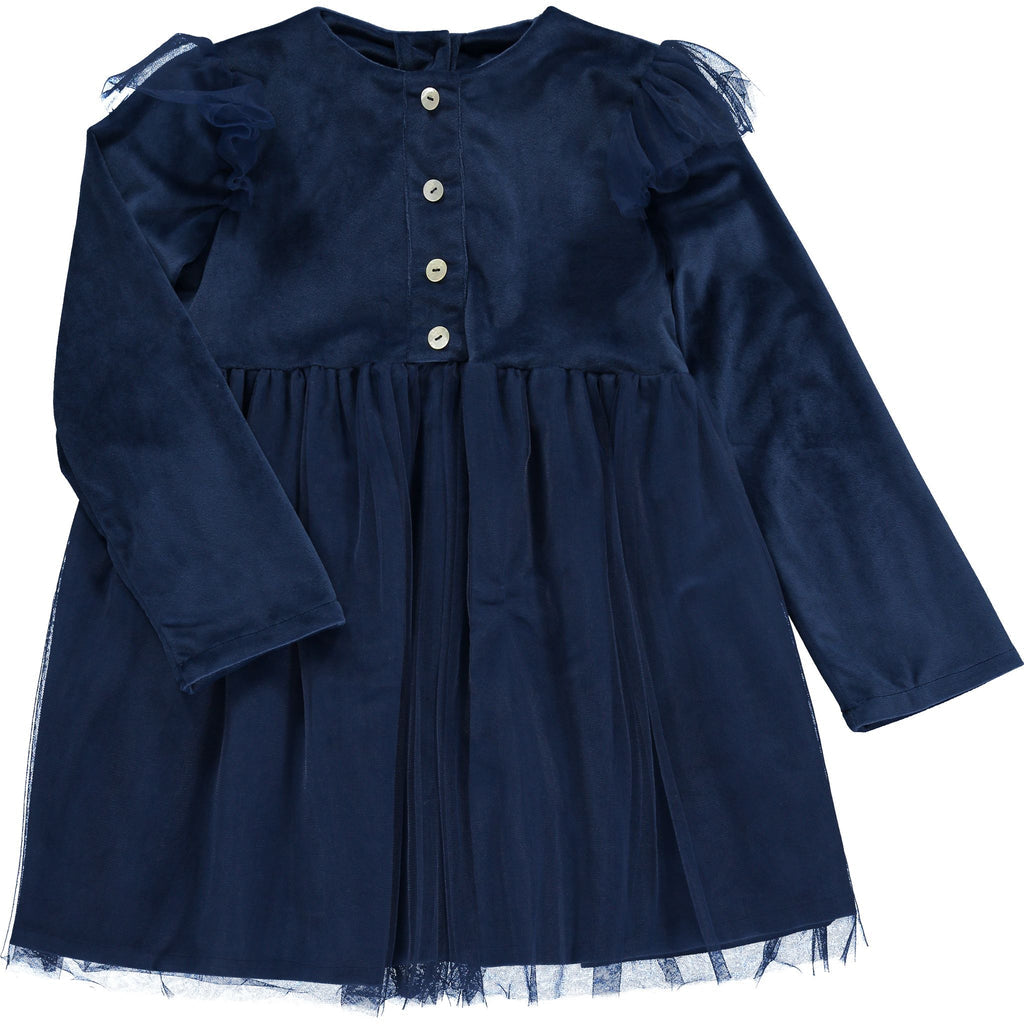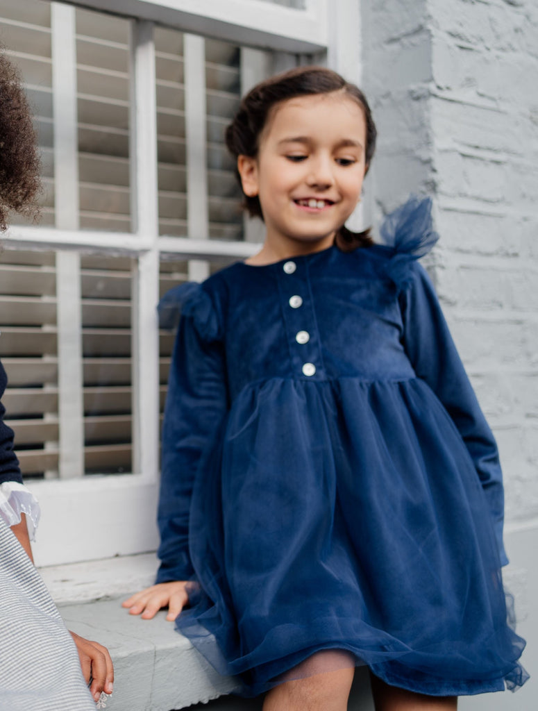 Hermoso vestido en velvet azul marino con detalles de Tul y botones en frente decorativos