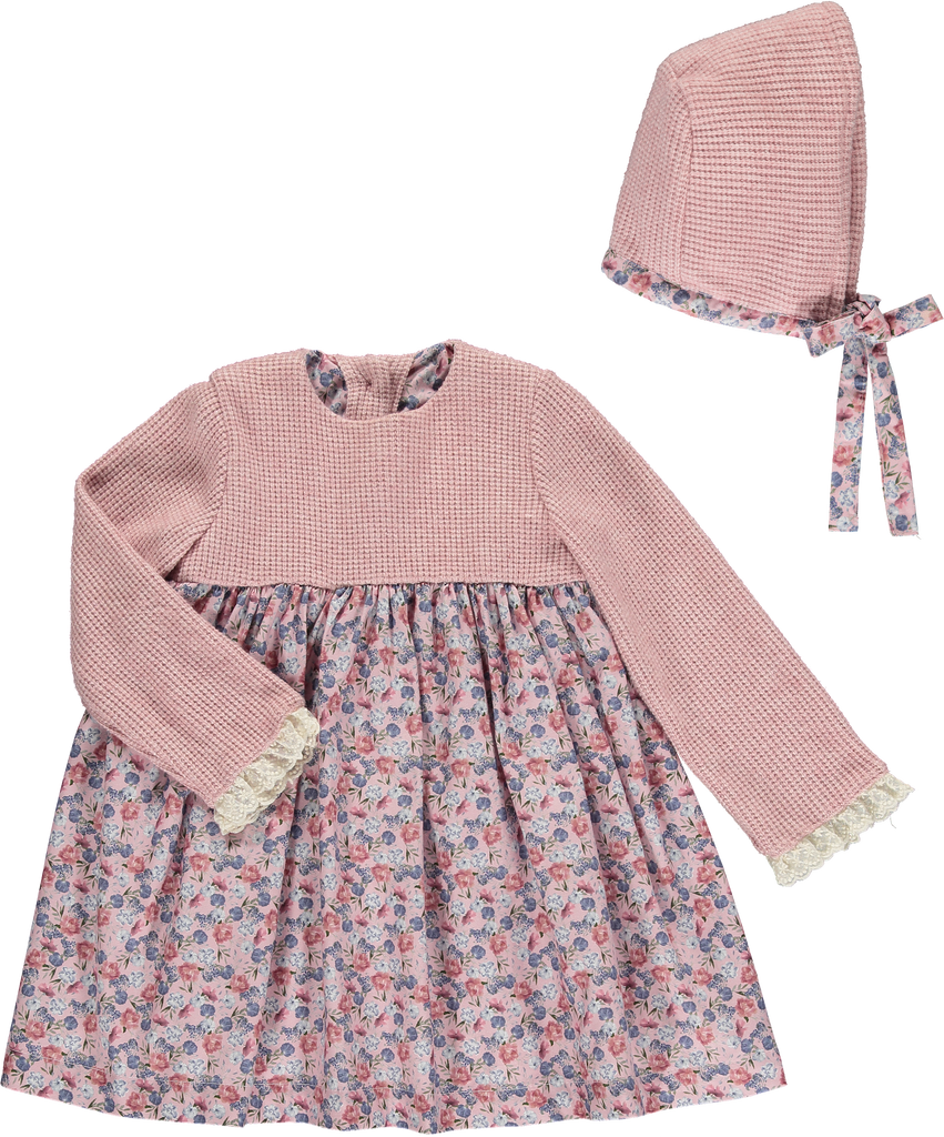 Hermoso outfit de 3 piezas : vestido, calzón y capota .