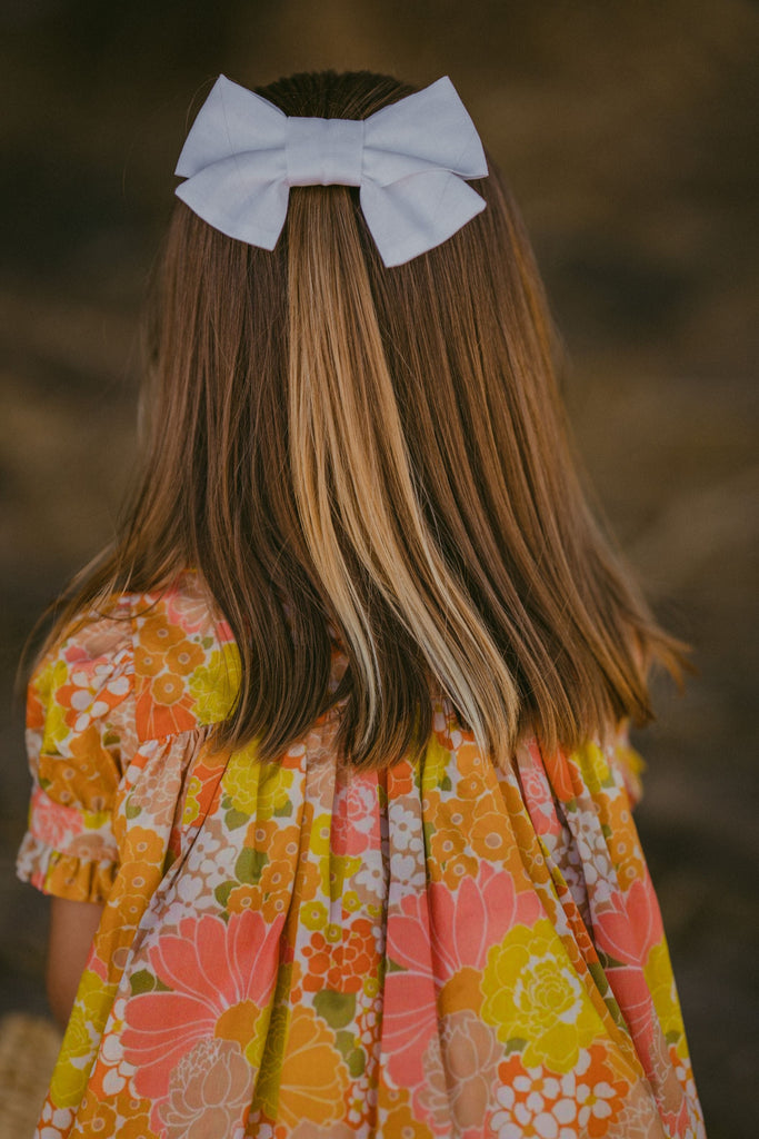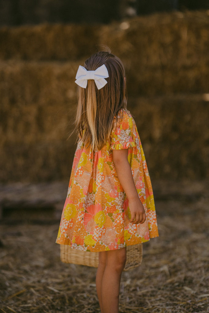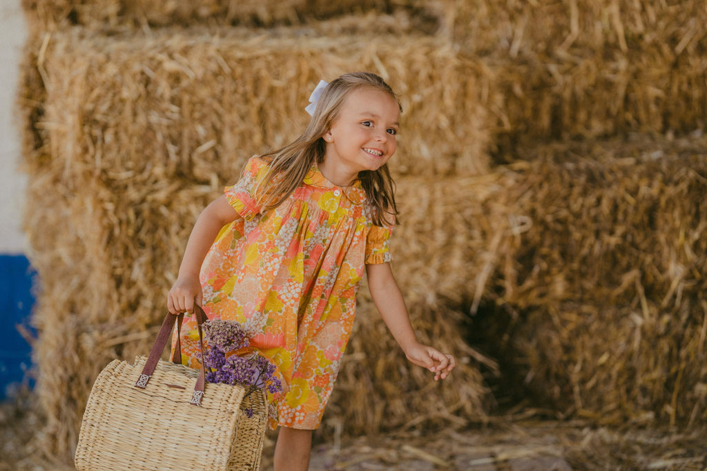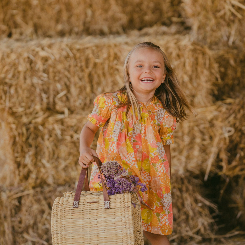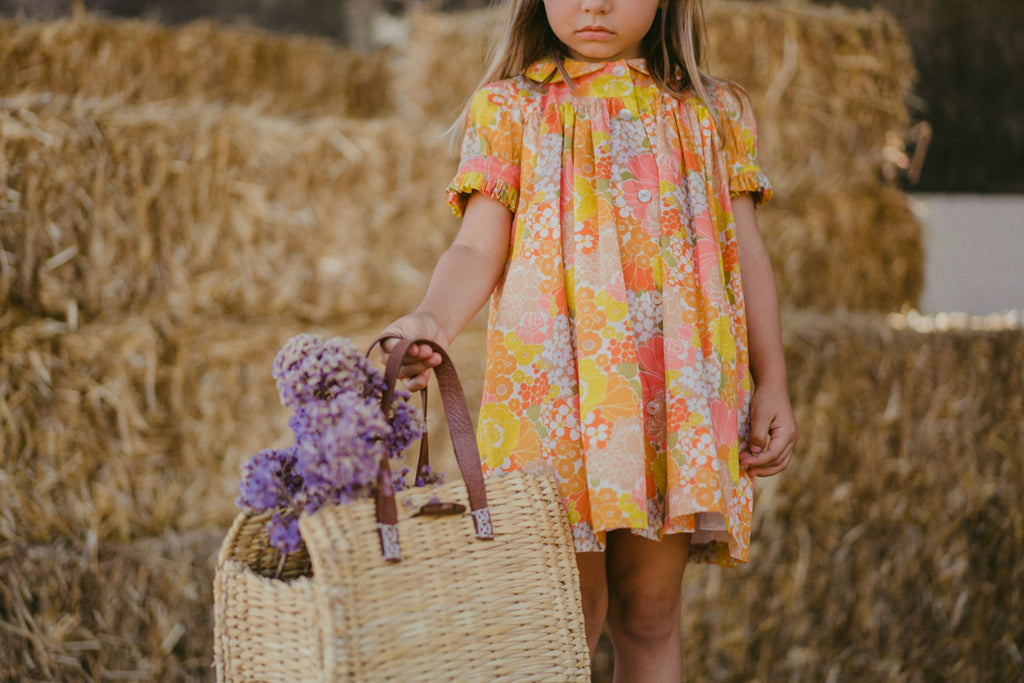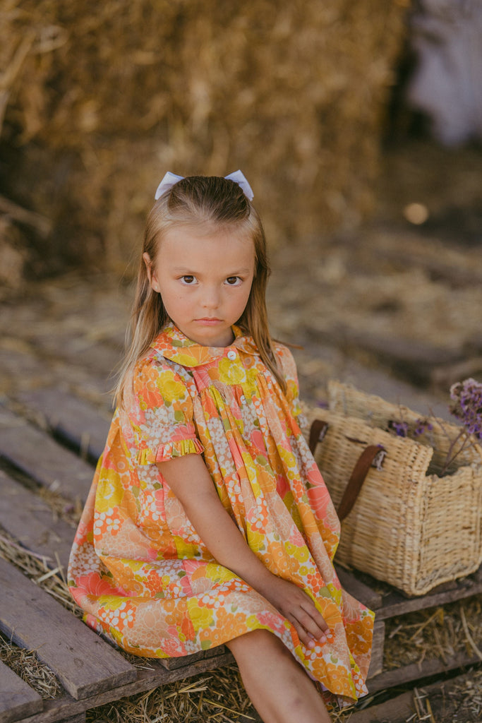 Vestido tipo batita, cuello redondo y estampado de “flower power” en vivos colores que nos evocan sin duda a la década de los 60s.