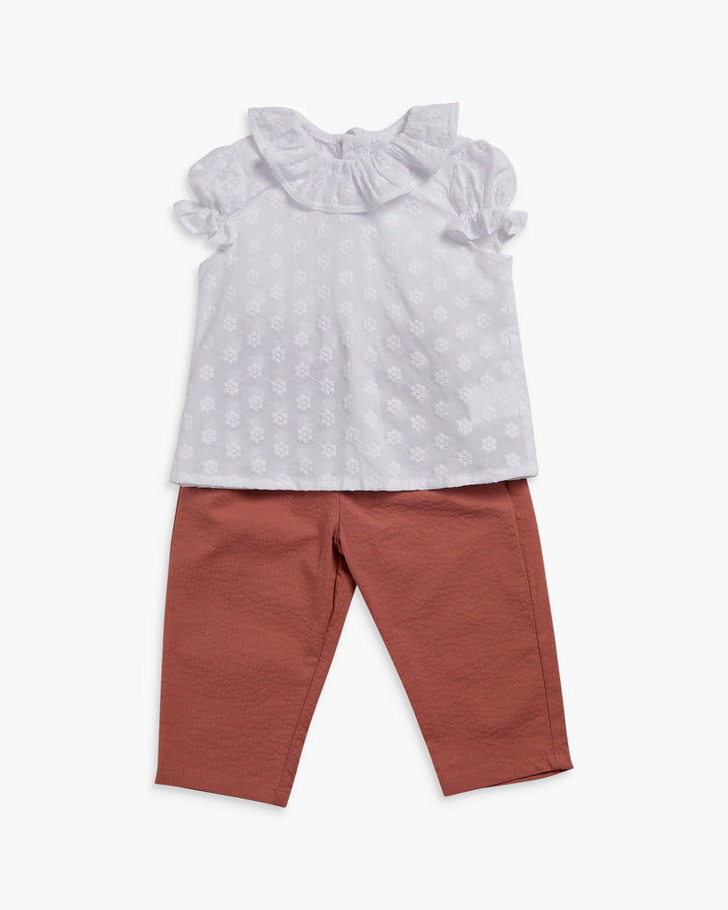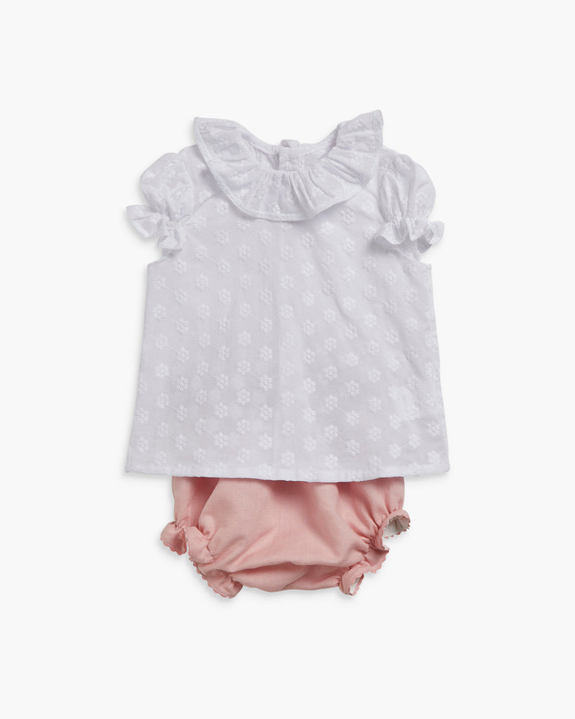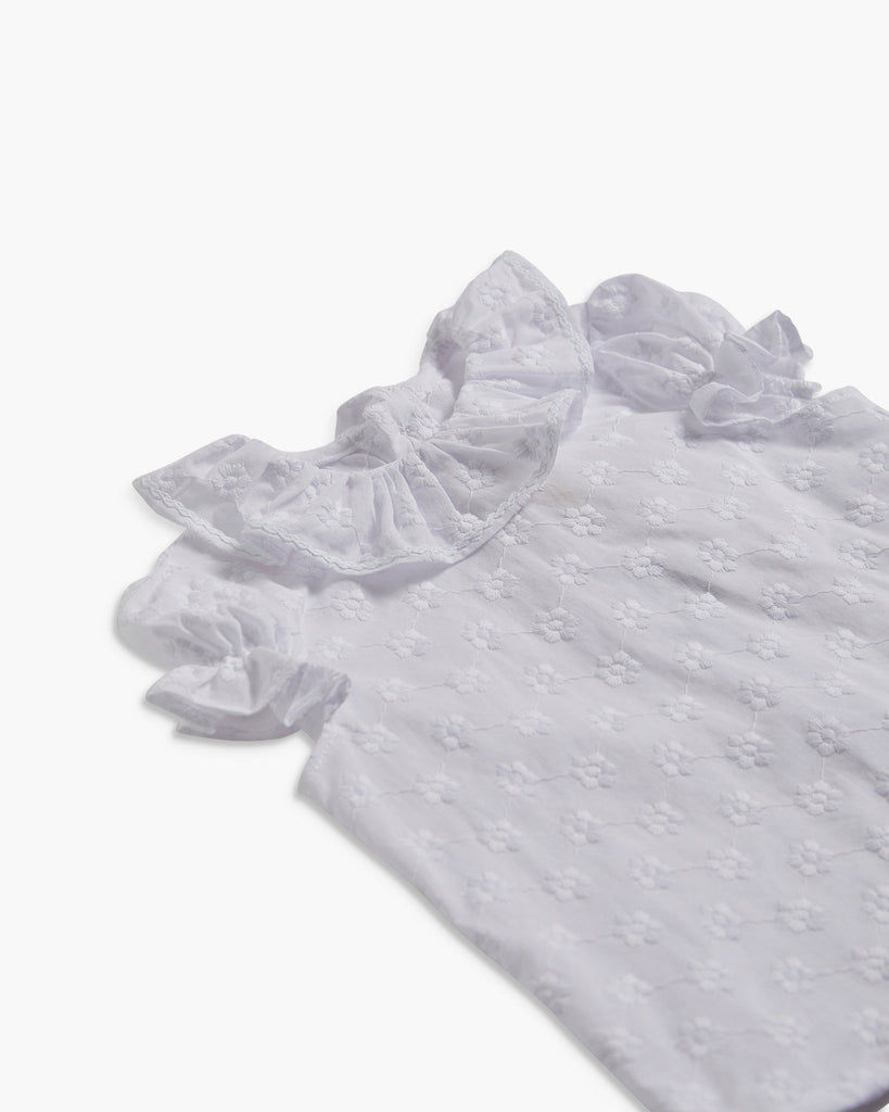 Disfrute de lo último en sofisticación y estilo con nuestra blusa Amelia con bordado blanco roto. Esta pieza atemporal presenta delicados volantes y un cuello clásico, perfecto para realzar tu look en cualquier ocasión. Con puños elásticos de manga corta y cierre de botón en la espalda, es a la vez cómodo y refinado. Combínalo con nuestros bombachos o pantalones de bebé para un conjunto completo y elegante sin esfuerzo.