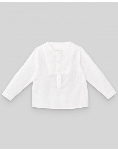 Camisa de manga larga, con botones en canesú. Cuello redondo. Manga ajustable con botón.