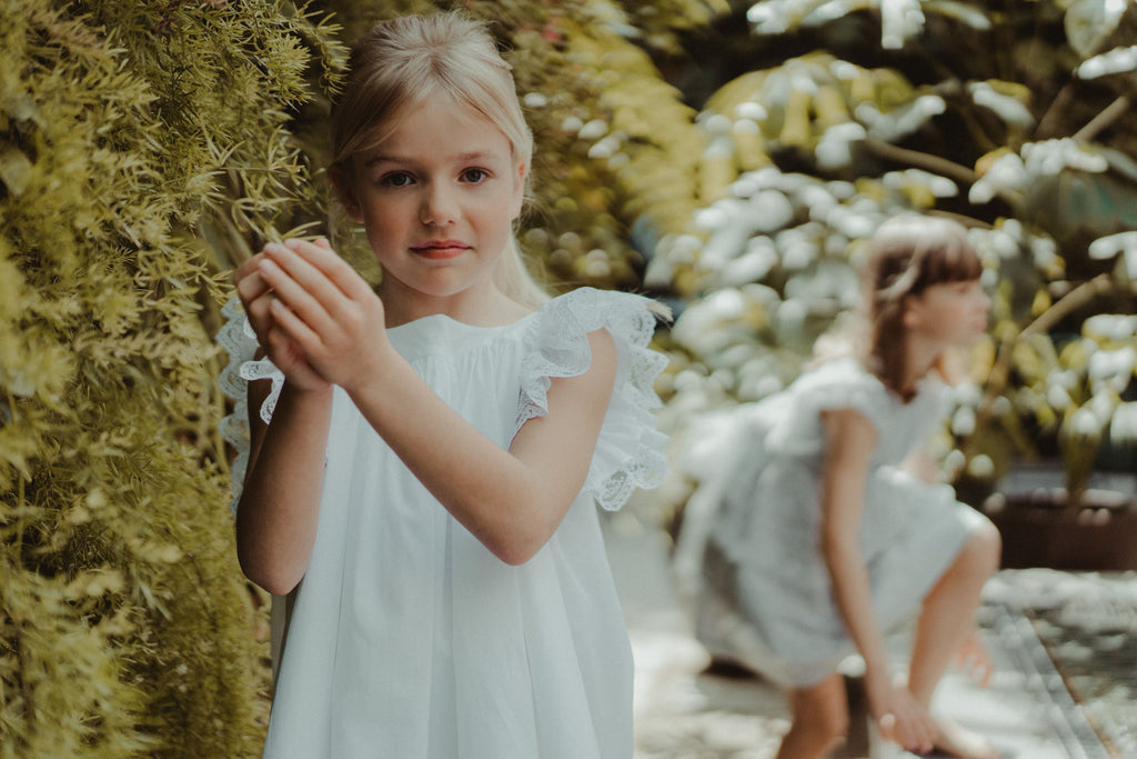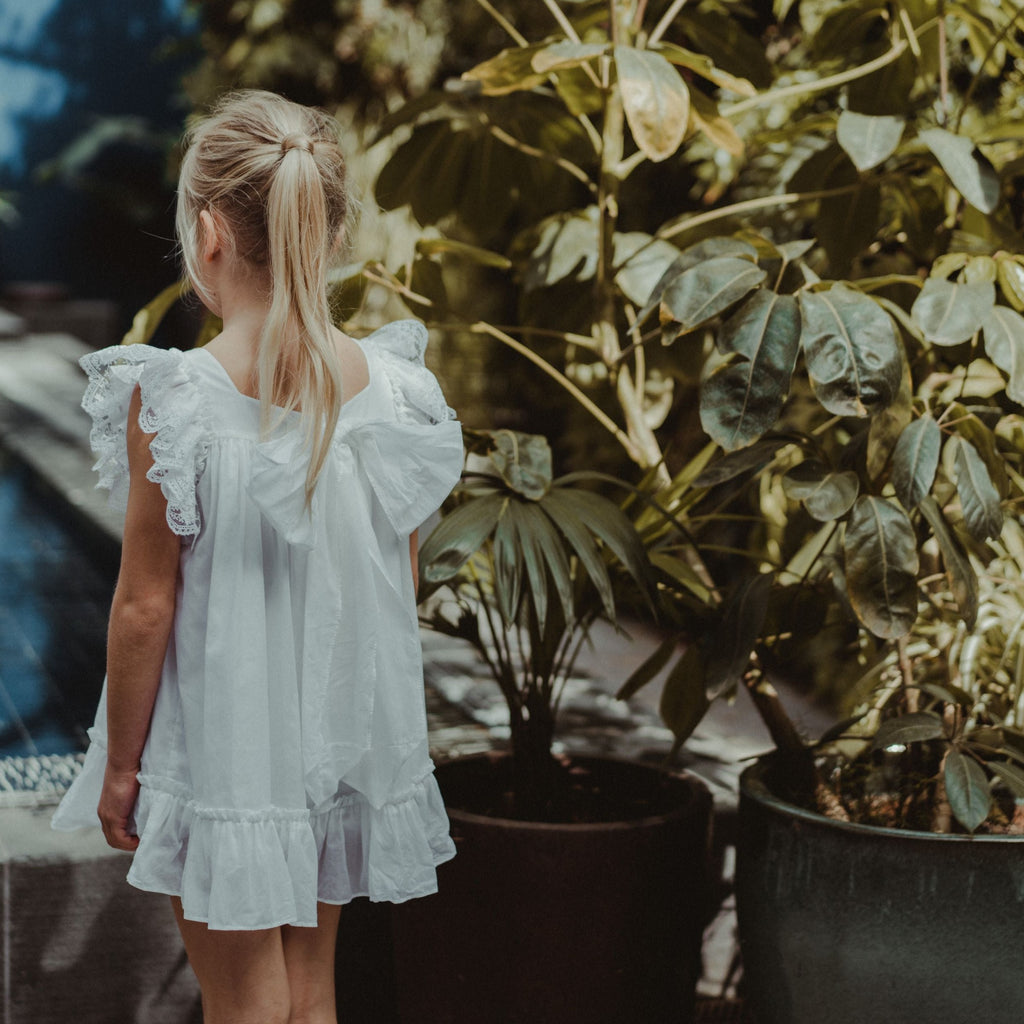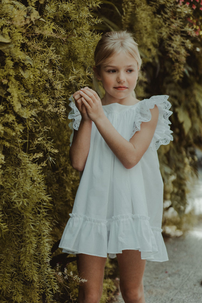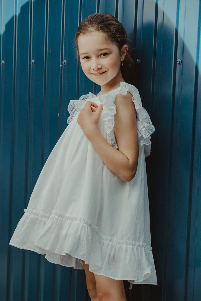 Hermoso vestido en tono blanco con lazo en espalda y encaje en mangas. Ideal para celebración!