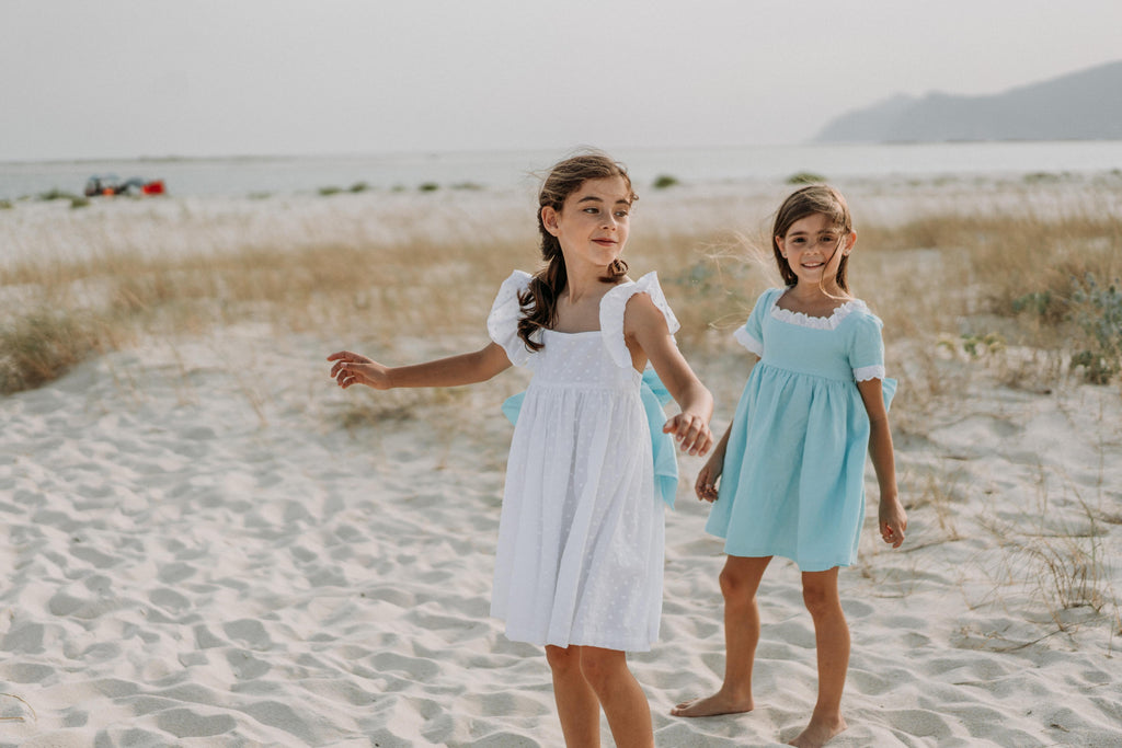 Los puntos bordados sobre algodón blanco aportan textura a este divertido vestido de verano.