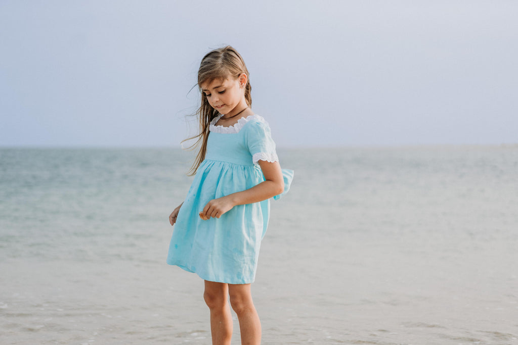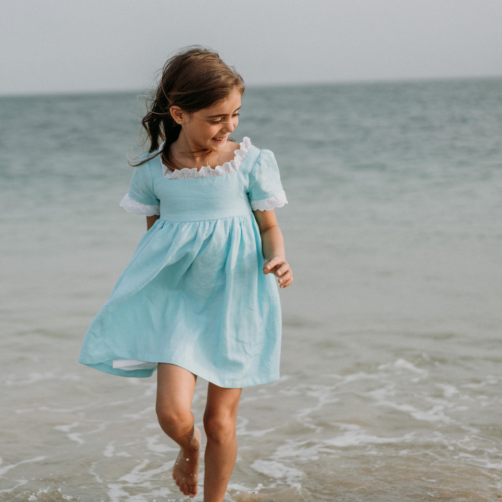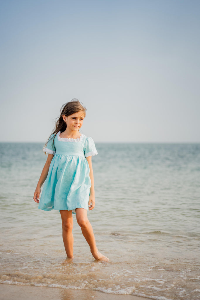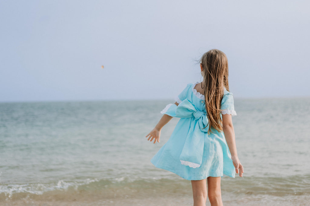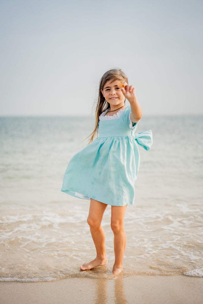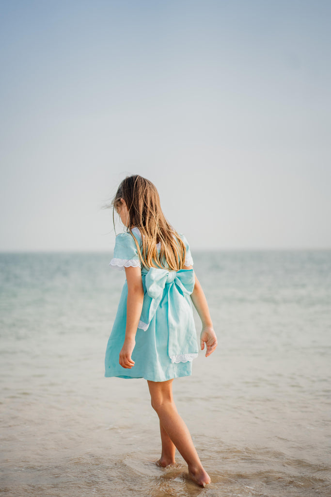 Un llamativo vestido de lino en color turquesa brillante. Lazo en espalda a juego