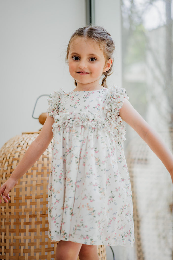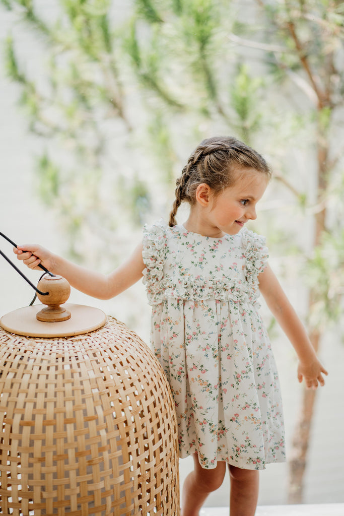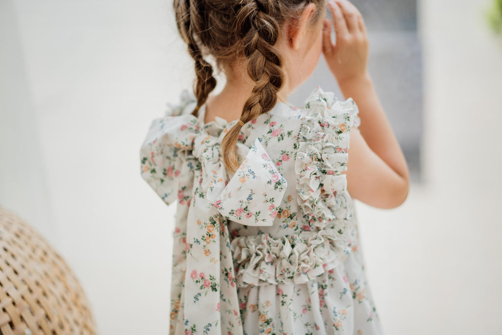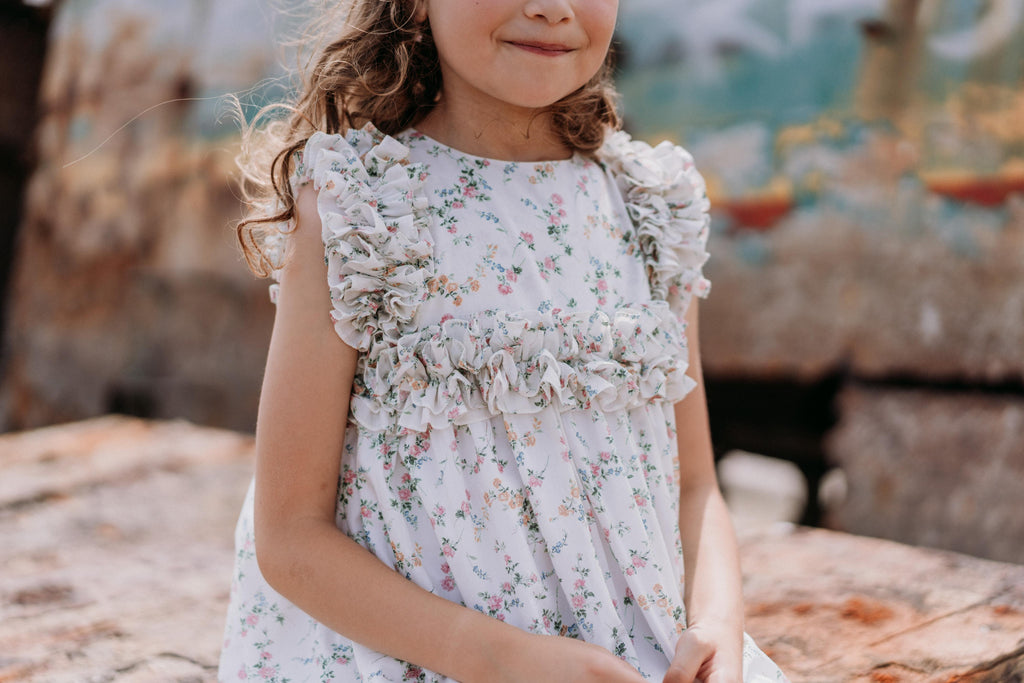 Un clásico de Benedita, un modelo que presenta un volante continuo en el pecho, los hombros y la espalda. Esta vez en una impresión de Liberty.