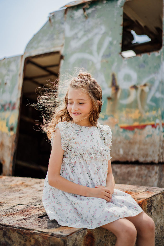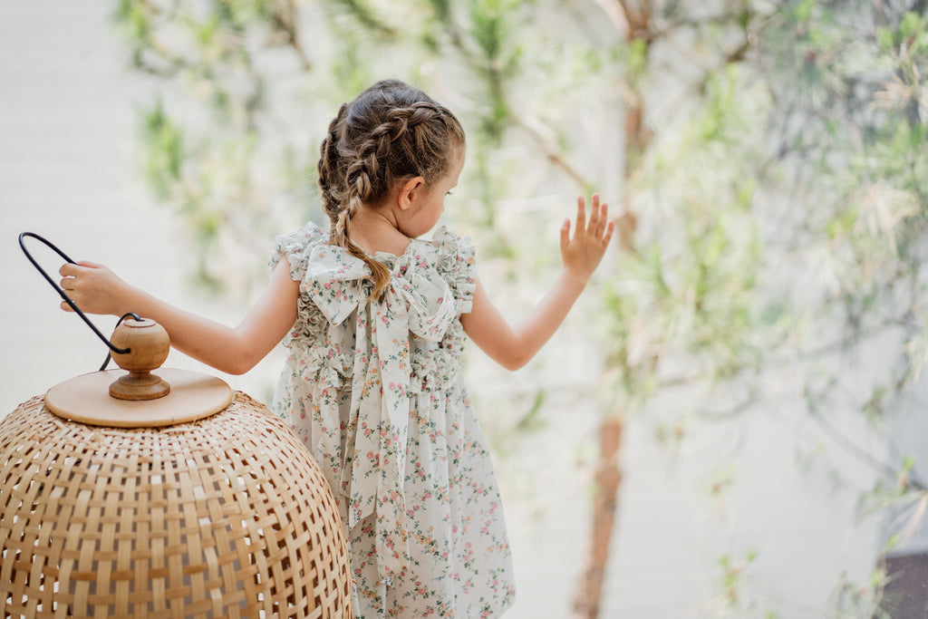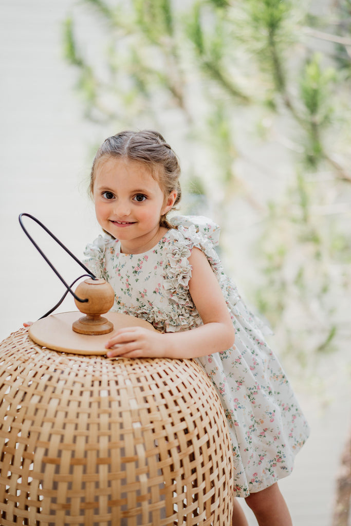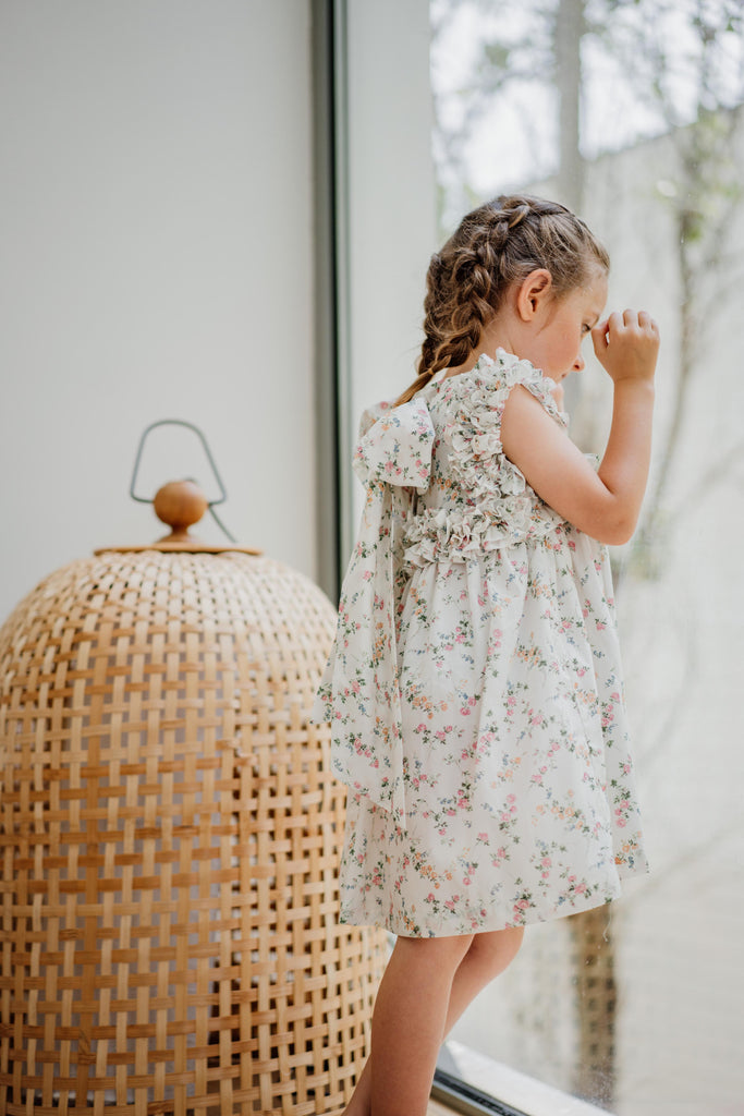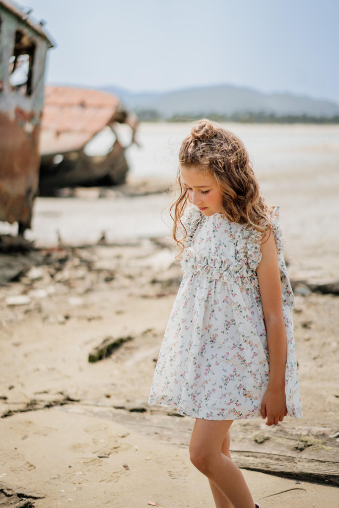 Un clásico de Benedita, un modelo que presenta un volante continuo en el pecho, los hombros y la espalda. Esta vez en una impresión de Liberty.