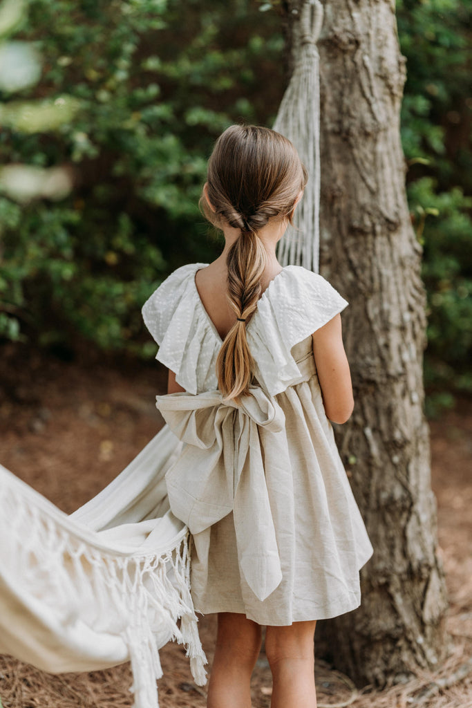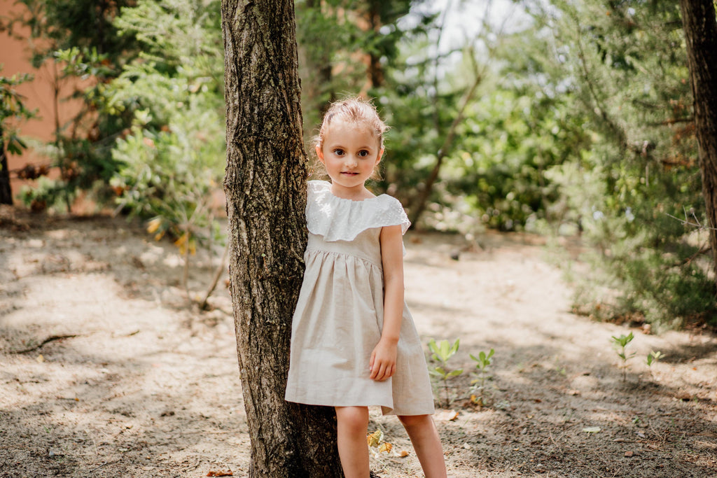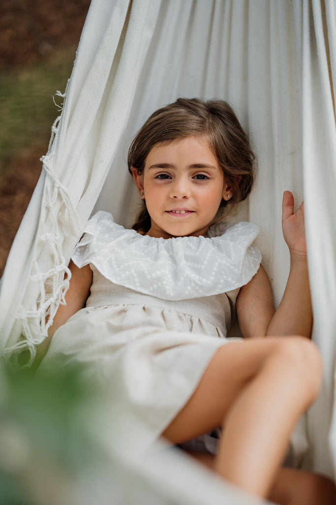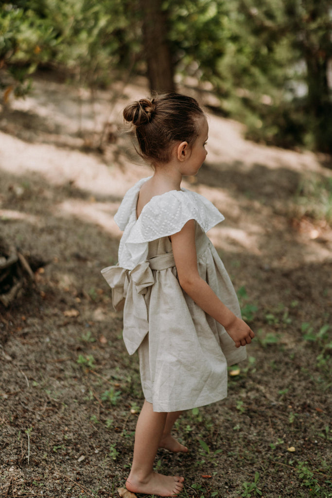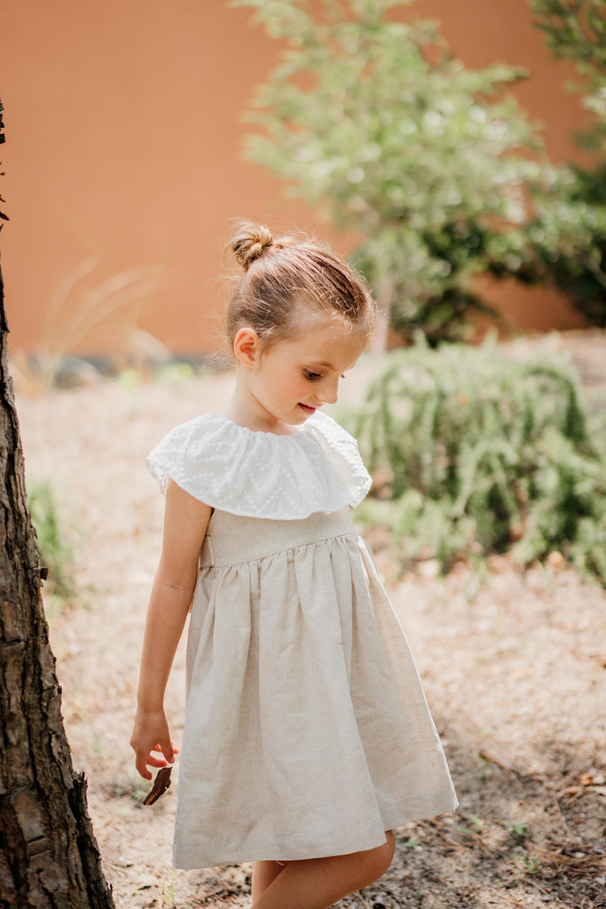 Vestido de lino beige con cuello oversize bordado en blanco.