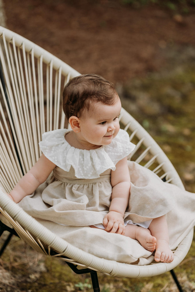 Lino beige con cuello oversize bordado en blanco. Pantalón bombacho de lino beige.