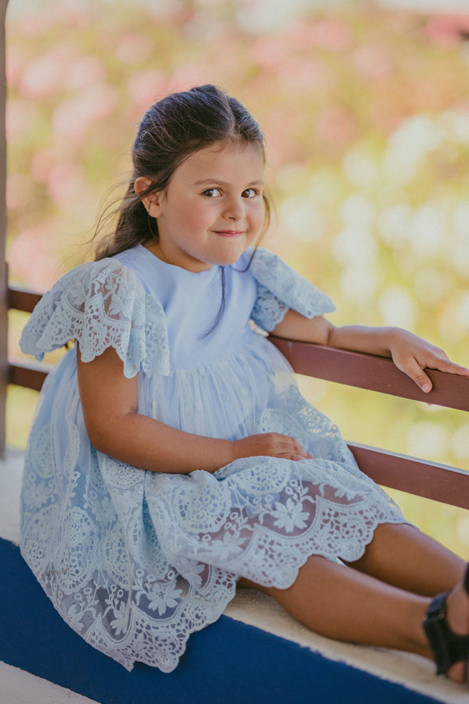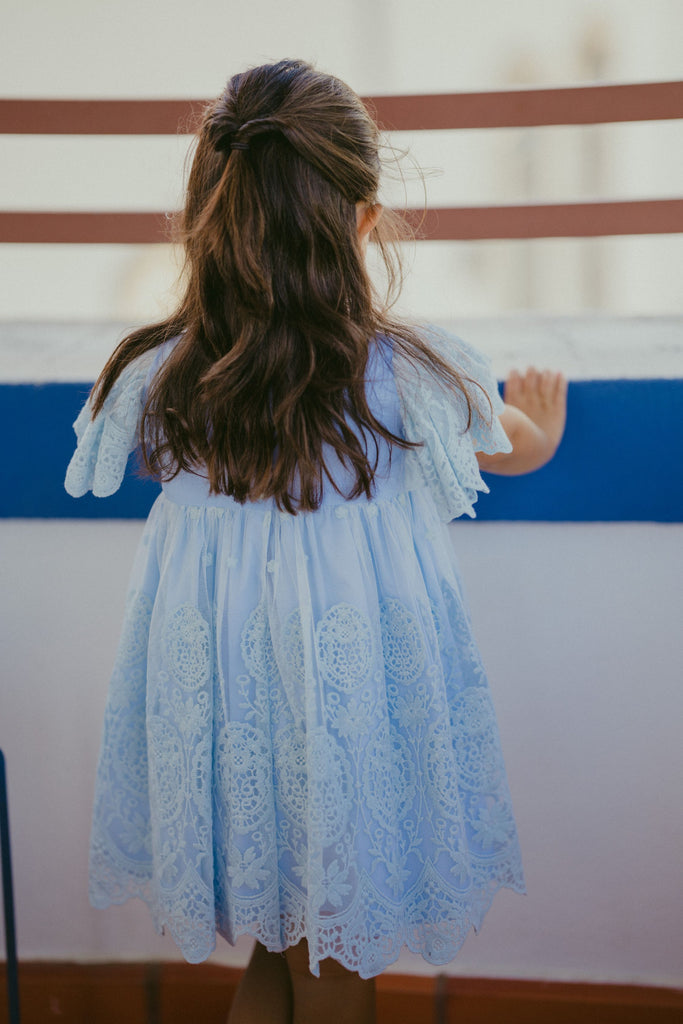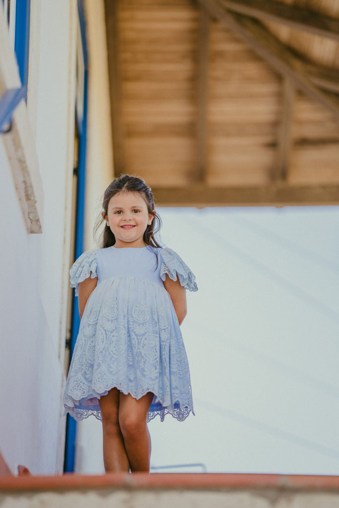 Hermoso vestido azul con des talles de encaje en mangas , falda. Botón de concha. Es un vestido con un trabajo hermoso.