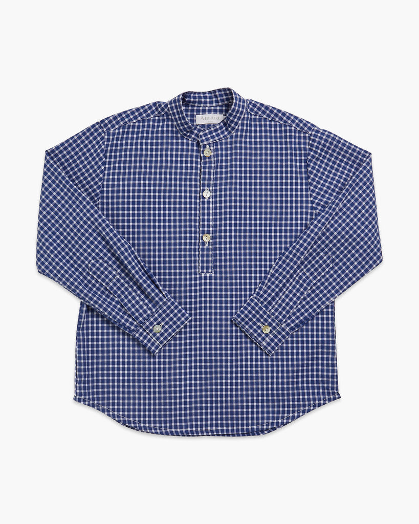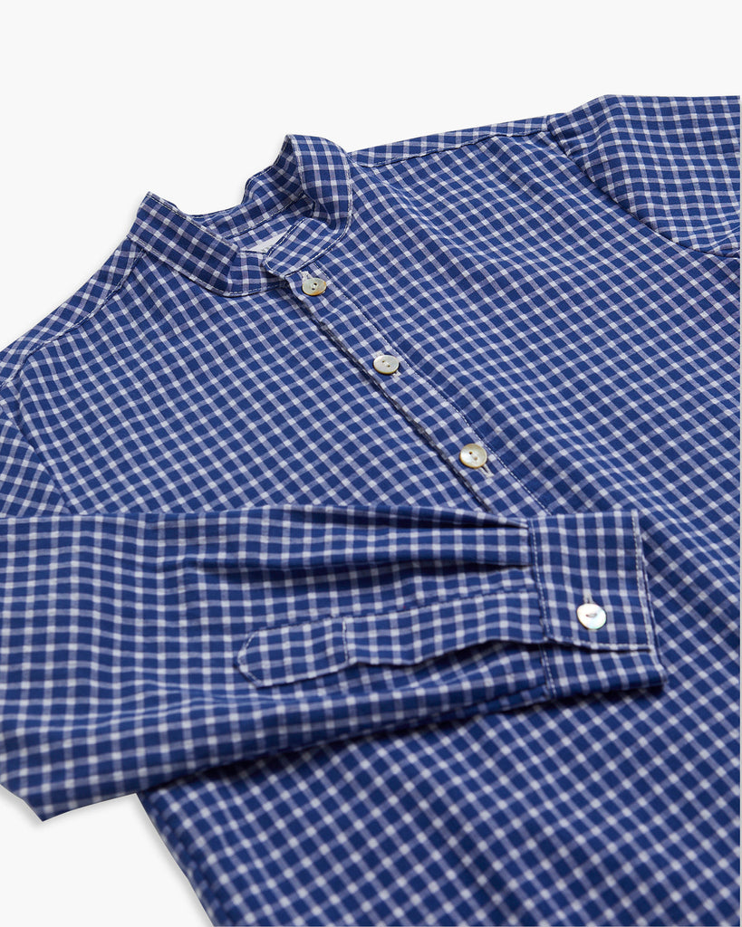 Salga con estilo con nuestra camisa Pereprin. Esta camisa clásica de manga larga con cuello mao presenta un lujoso cuadro índigo que seguramente llamará la atención. Confeccionada con un suave tejido de algodón de primera calidad y con una tapeta con botones de nácar, esta camisa es una prenda básica versátil para cualquier guardarropa. Combínalo con nuestros pantalones cortos y pantalones a juego para lograr un look encantador y elegante.