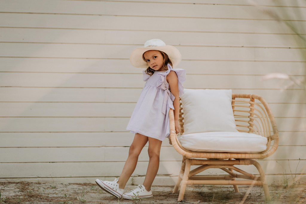 Vestido de cuadros color lavanda con lazos laterales a juego.