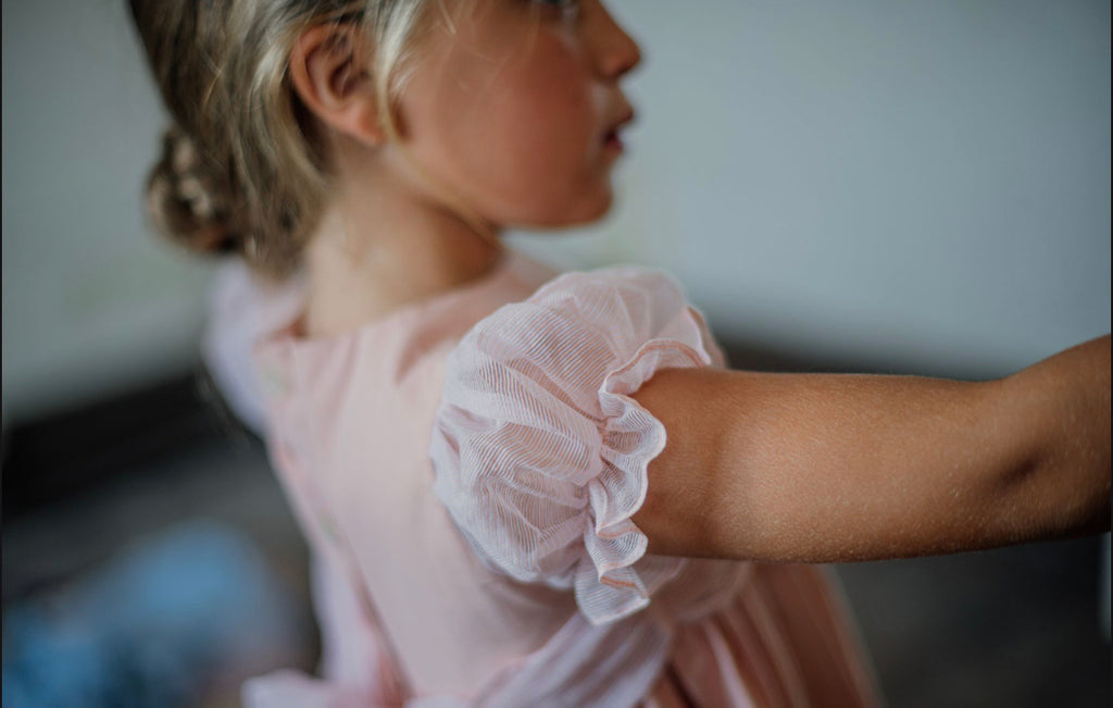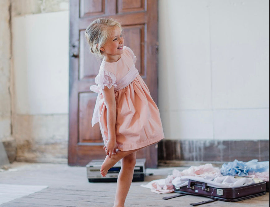 Vestido clásico en tono rosa palo. Con detalle de transparencia en las mangas abullonadas y el lazo que enmarcan la silueta romántica de este modelo. Prenda elaborada con algodón 100% orgánico. OEKO-TEX 100 Certified and GOTS Certified Organic