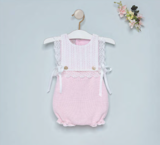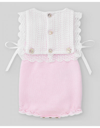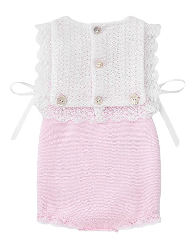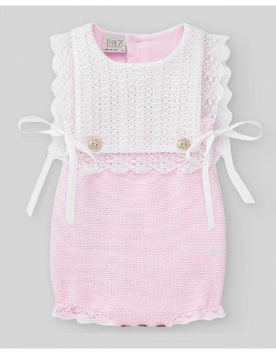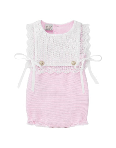 Pelele corto en punto y tela, diseñado para bebé, con cuello redondo y cierre trasero con botones de nácar PAZ Rodríguez.