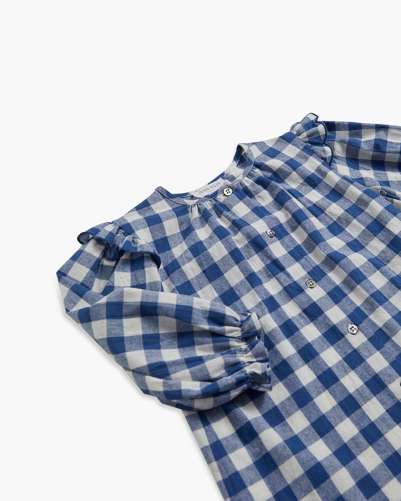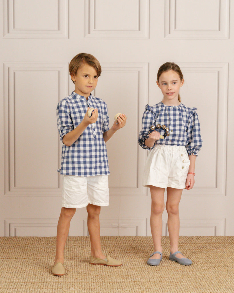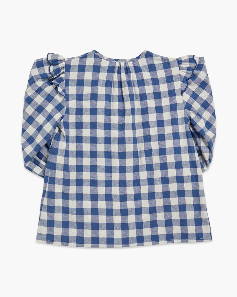 Ligera y elegante, esta blusa está confeccionada con un suave material de algodón con un clásico estampado vichy índigo. El encantador detalle de volantes sobre los hombros añade un toque de sofisticación. Diseñada con un cierre frontal con botones clásicos de nácar y puños elásticos, esta blusa ofrece comodidad y estilo en un corte relajado. Realza el conjunto de tu pequeña con nuestros pantalones cortos, pantalones y accesorios a juego.