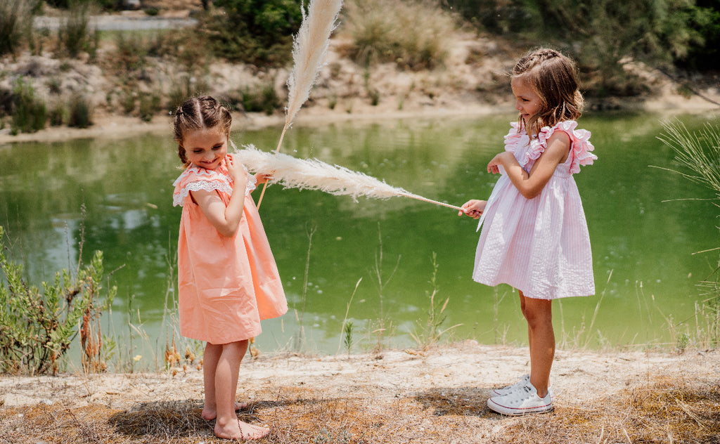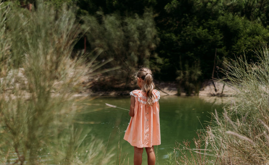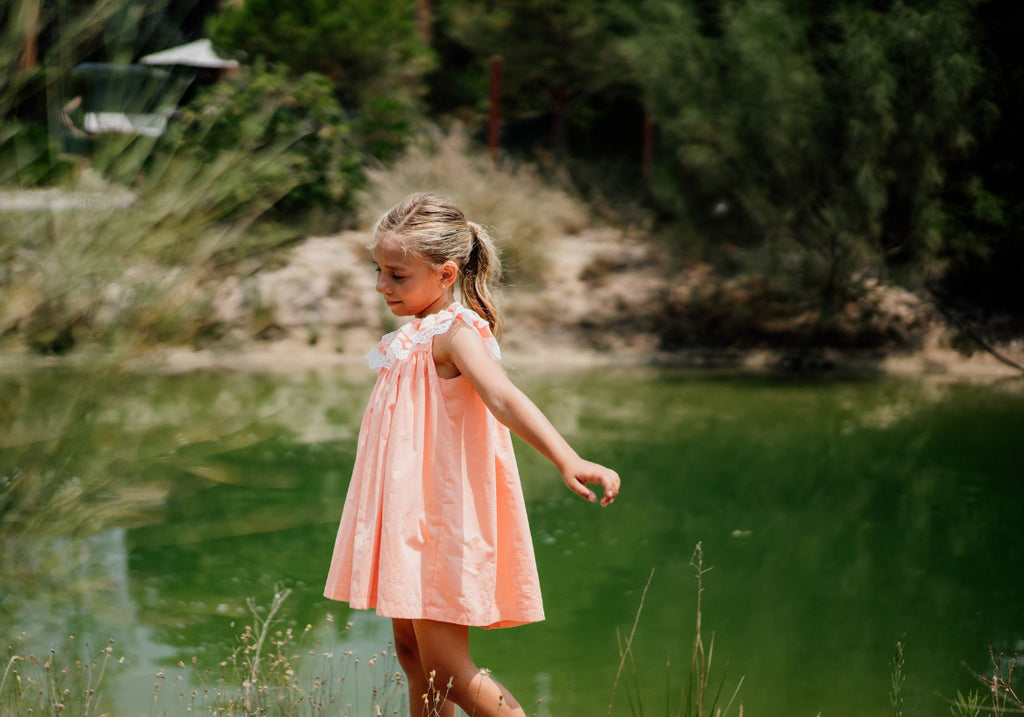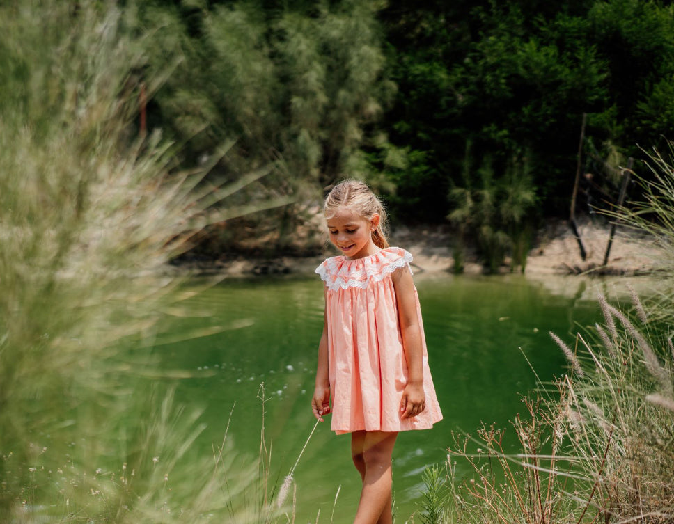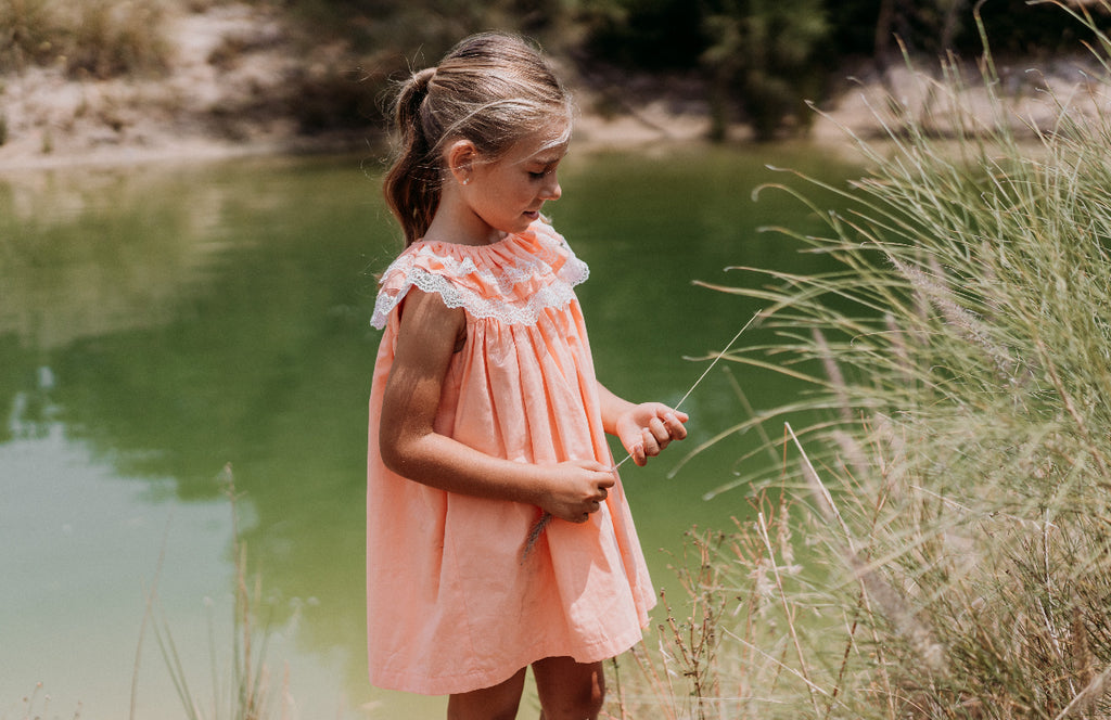 Vestido coral con cuello con doble volante, cada uno adornado con encaje.