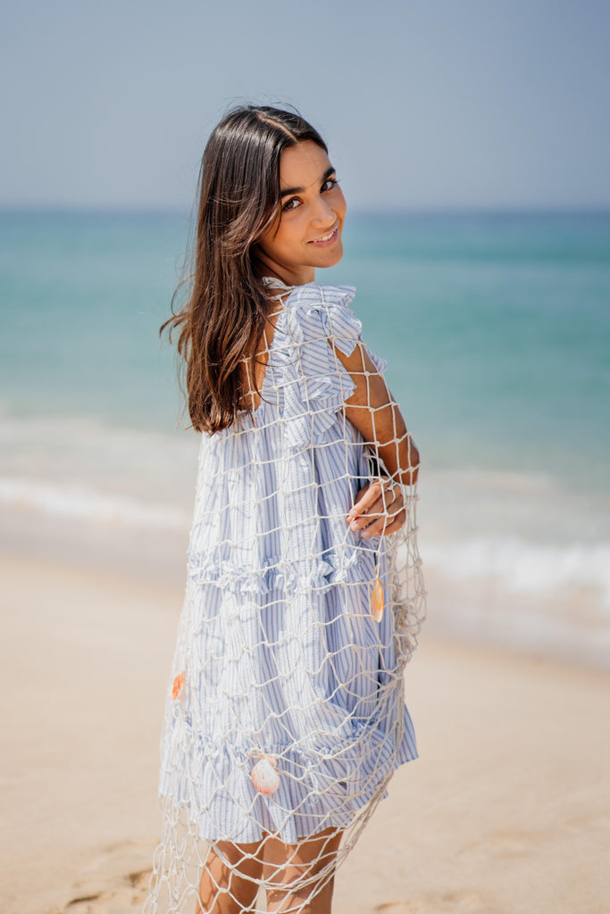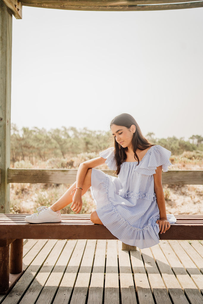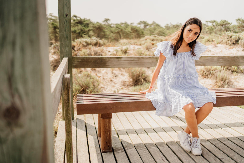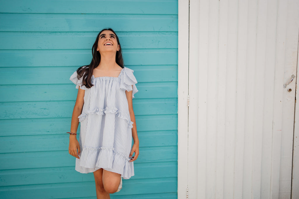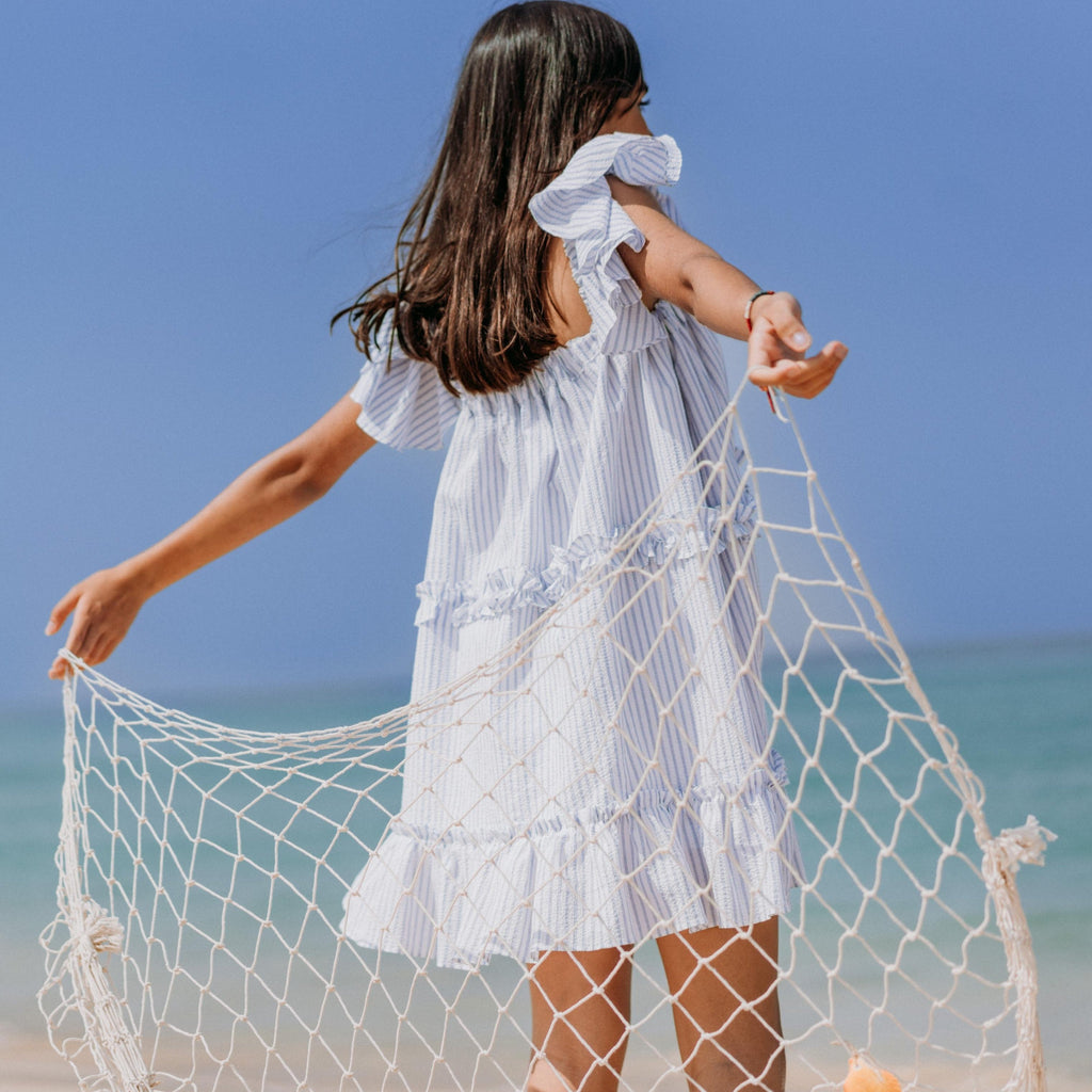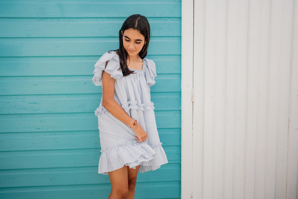 Rayas azul claro sobre seersucker blanco, vestido escalonado con tirantes con volantes