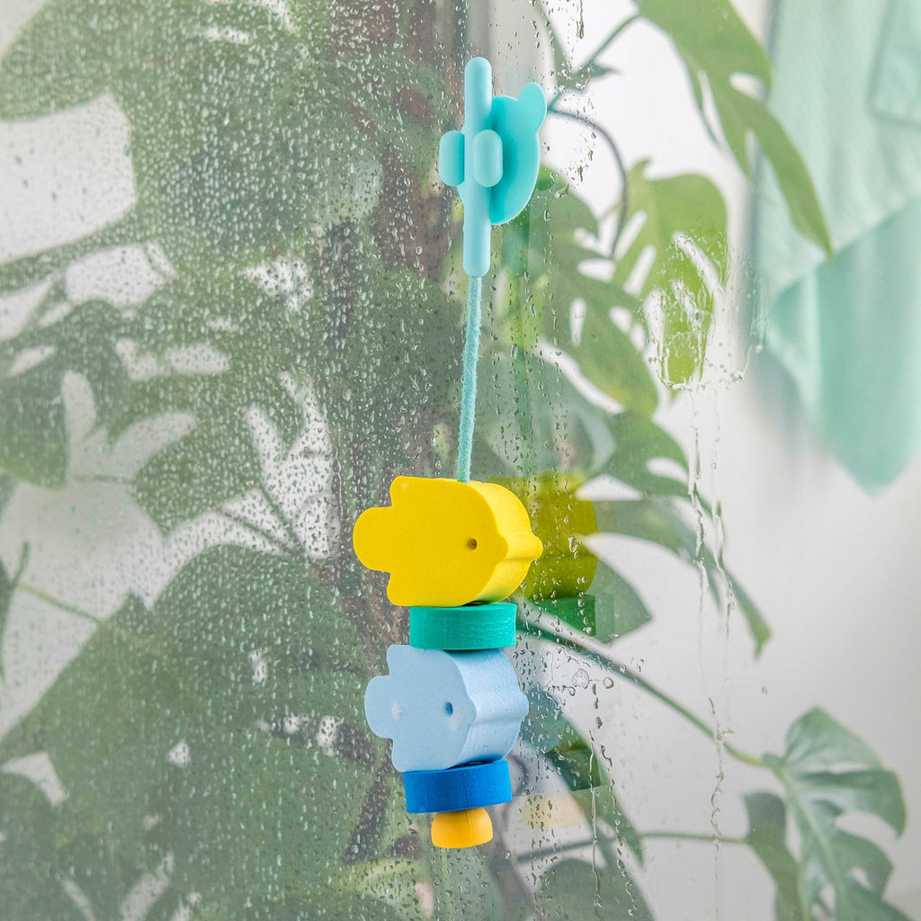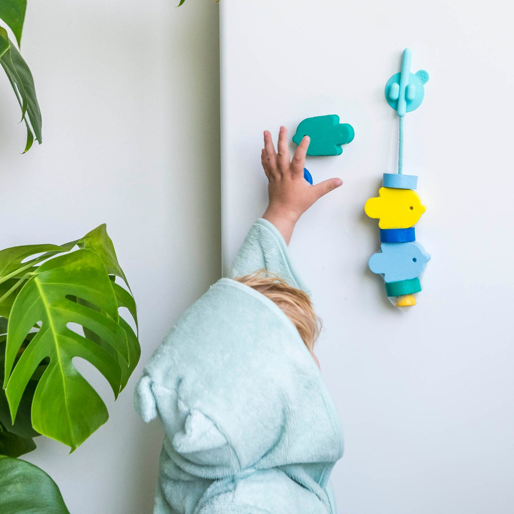 ¡Las primeras cuentas para ensartar de tus hijos! A partir de los 10 meses, tus pequeños podrán jugar con los grandes bloques de espuma suave que flotan en el agua y se adhieren a la pared de la bañera.