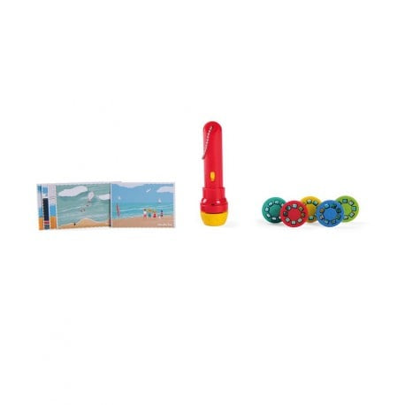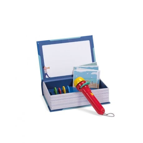 Esta cajita contiene una lámpara de juguete con 5 discos de cuentos que se proyectan en la pared.