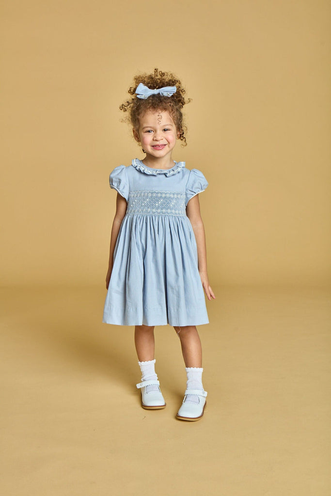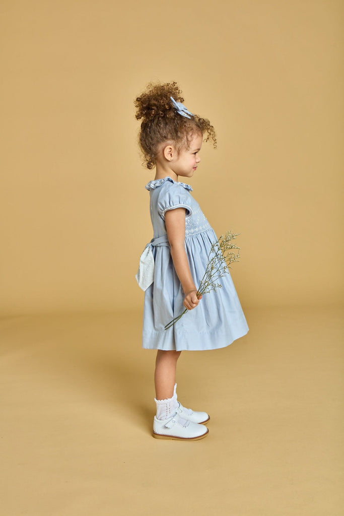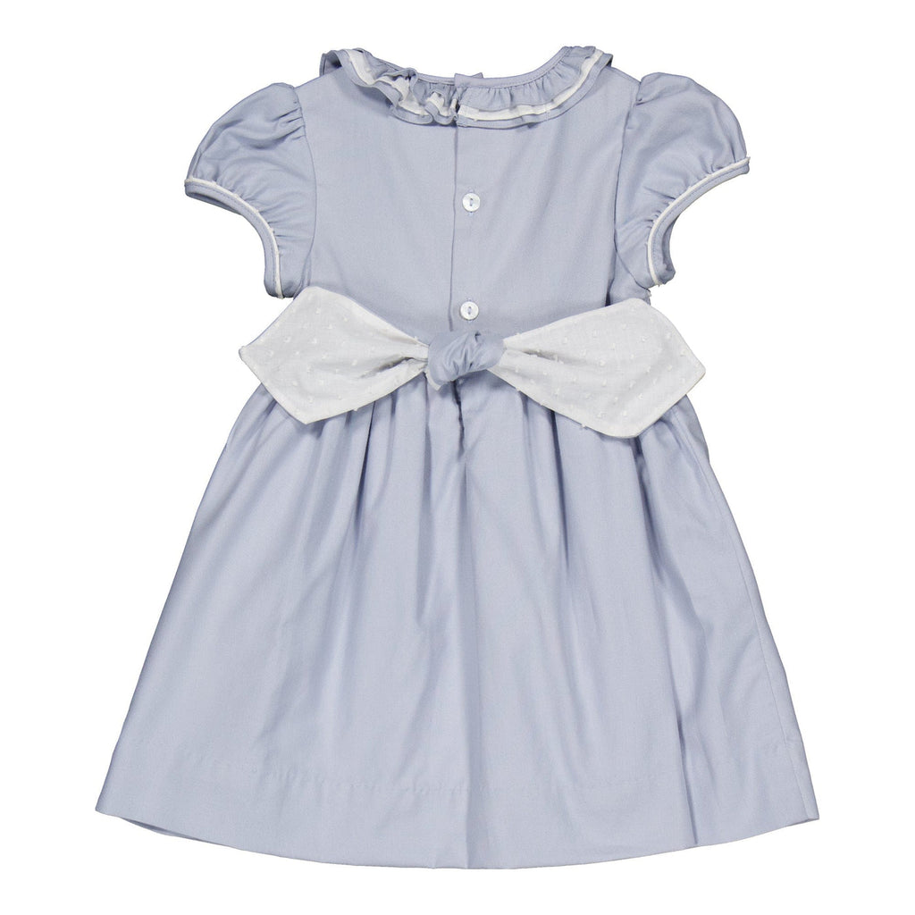 Smocked dress with puff sleeves and triple collar, in Artic blue organic cotton twill.