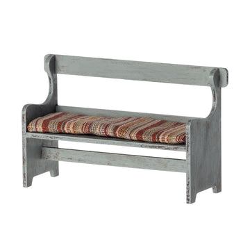 Un clásico banco de madera para que nuestra familia de ratones pueda disfrutar. Tiene un hermoso aspecto vintage pintado a mano - pueden ocurrir variaciones - y un suave cojín en la parte superior del banco para un asiento cómodo.