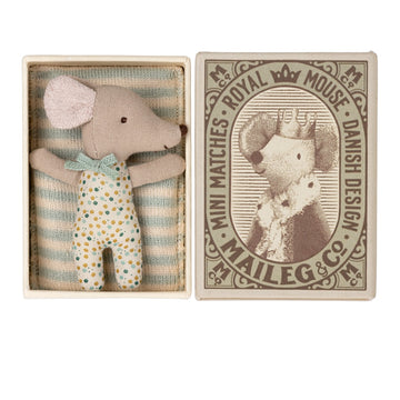 Un artículo clásico de Maileg. Nuestro bebé ratón está listo para horas de juego y duerme cómodamente en la pequeña caja de cerillas. Su pijama de colores y la ropa de cama están hechas de telas suaves con estampados únicos en hermosos colores.