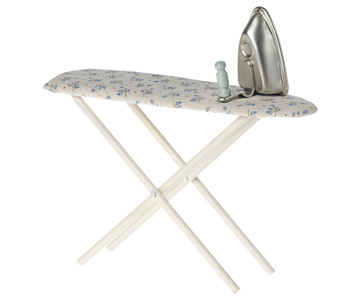 Nuestra plancha y tabla de planchar son perfectas para nuestra casa de muñecas. El nuevo diseño incluye una hermosa tela floral azul en la tabla, con patas de metal que se pliegan como una tabla de planchar de verdad.