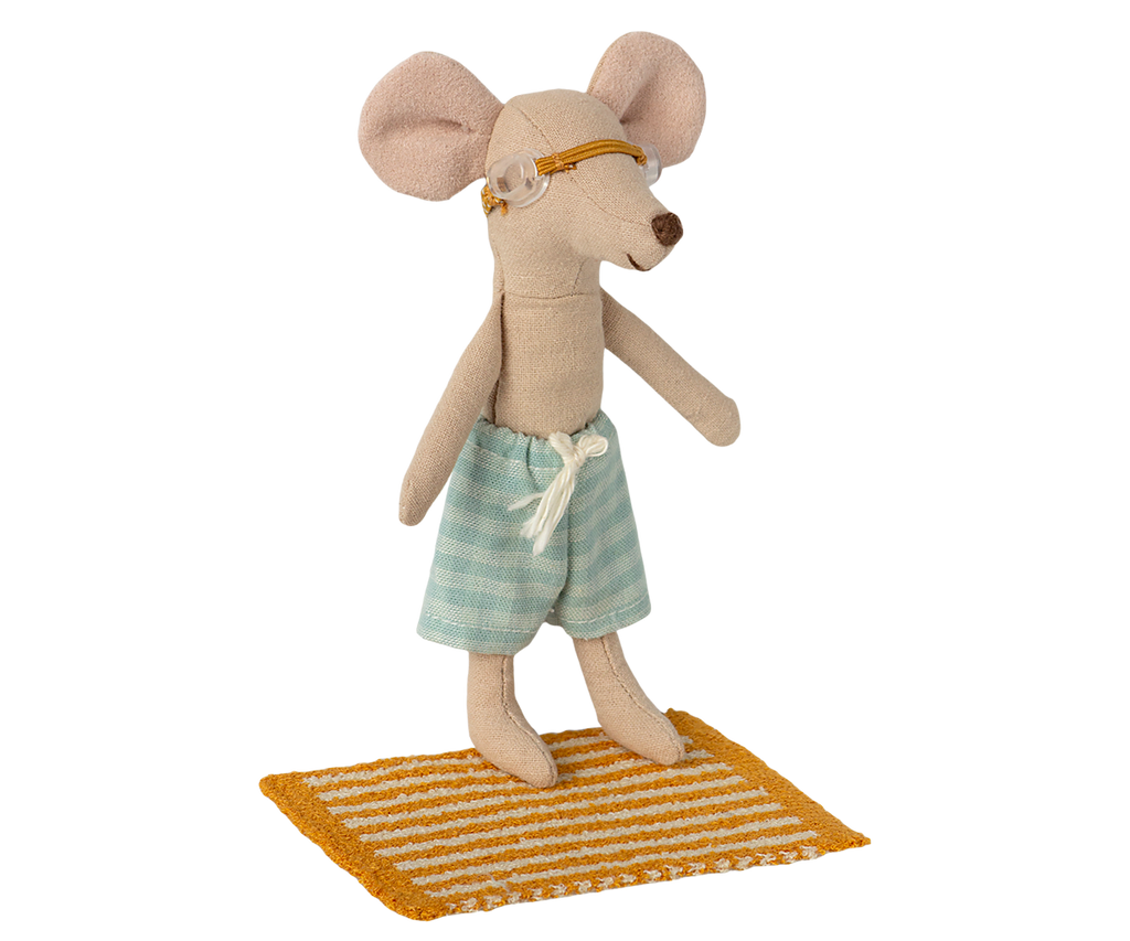 Tiempo de vacaciones!! Este conjunto incluye todos los accesorios esenciales para un día divertido en la playa: un short de baño, unos googles y una toalla. Todo se ajusta perfectamente a los ratones en tamaño hermano/hermana mayor.