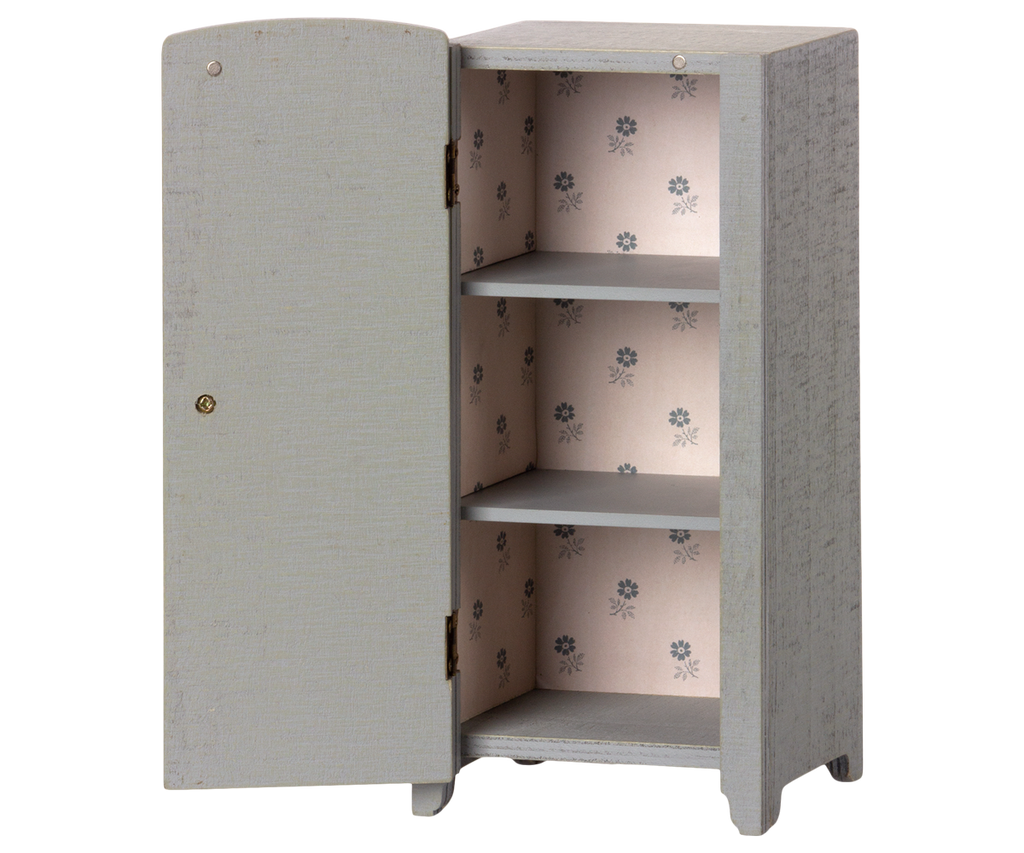 Este armario con decoración vintage tiene un hermoso estampado de flores en relieve al frente y un hermoso papel tapiz impreso en el interior. Las estanterías interiores permitirán a nuestros amigos conejos organizar su casa de forma creativa. Este armario se adapta a la casa de conejos Maileg.