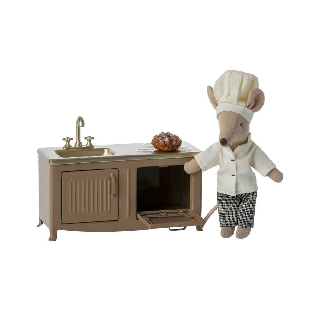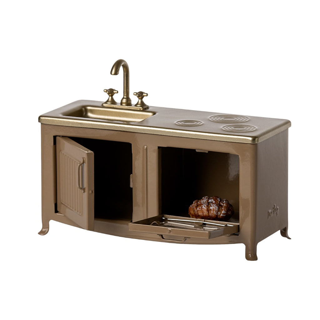 El corazón de cada hogar es la cocina. Esta cocina de metal tiene un hermoso tono de color café vintage y cuenta con muchos detalles juguetones como la puerta del armario, el fregadero y un horno con un pastel recién horneado. Es perfecta en tamaño para la familia de ratones.