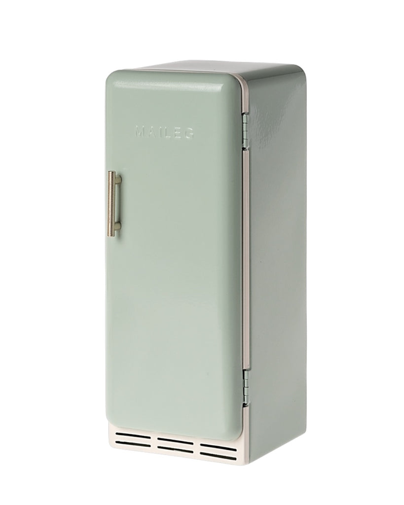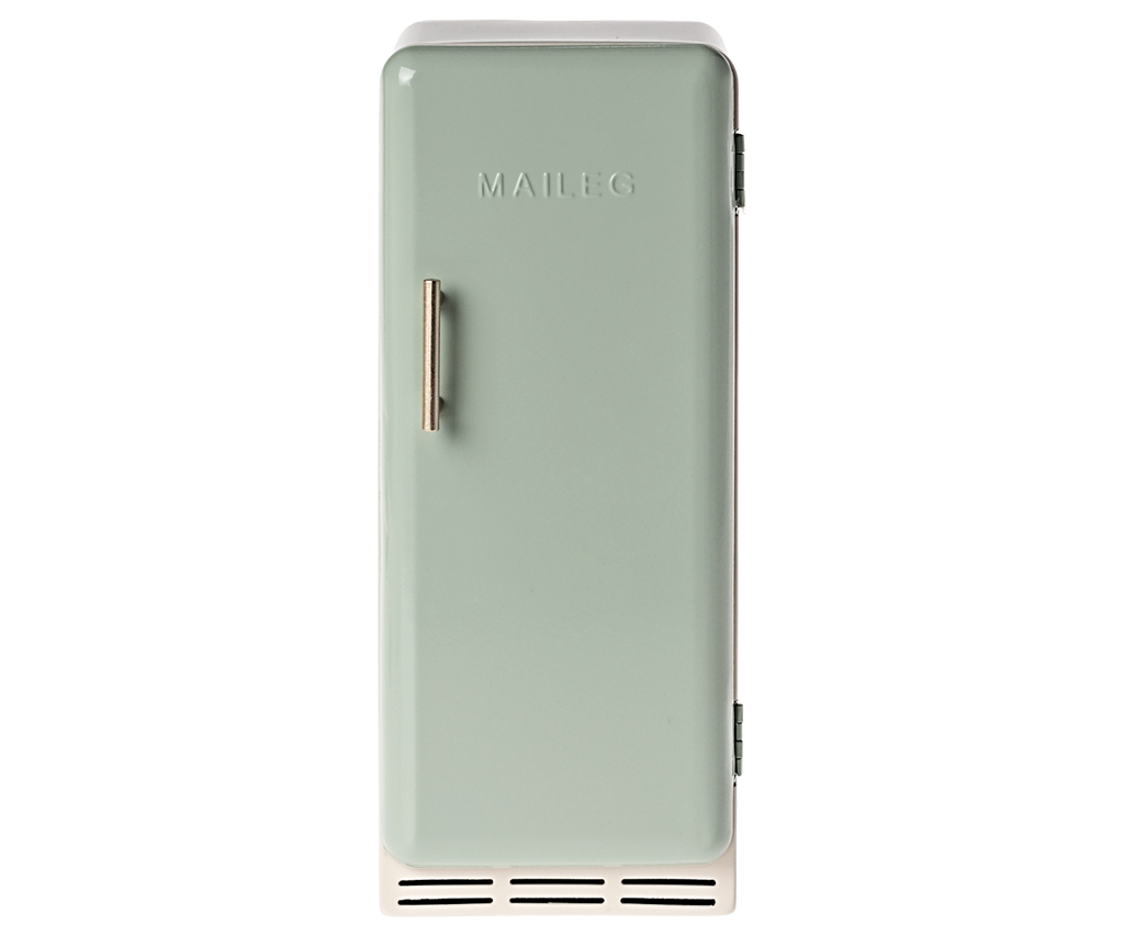 Una nevera a la antigua en color menta que encaja perfectamente en la casa de nuestros divertidos conejos. La nevera está hecha de metal con cerradura magnética y estantes esmerilados en el interior. Una gran adición a esta nevera es nuestra caja de supermercado en miniatura, se compra aparte.