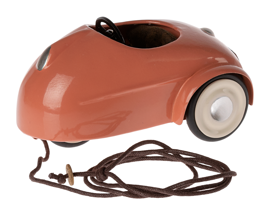 El coche de metal color Coral Intenso, es un transporte perfecto para cualquier ratón. Caben todos los ratones en tamaños de hermanito/a, hermano/a mayor y mamá/papá. La cuerda incluida se puede atar debajo del coche para que el niño pueda tirar del coche.