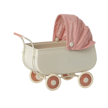 Un precioso cochecito Maileg con un exclusivo look vintage. La parte metálica tiene detalles en relieve en los laterales y la funda de tela completa el look. El cochecito es perfecto para pasear cuando el bebé duerme.