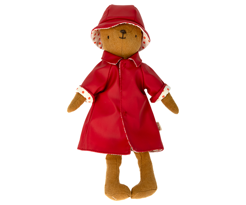 Un hermoso conjunto de ropa para lluvia con el que mamá Teddy estará a la moda. Seguro la mantendrá seca en días de lluvia. Este conjunto consiste en un abrigo y un sombrero.