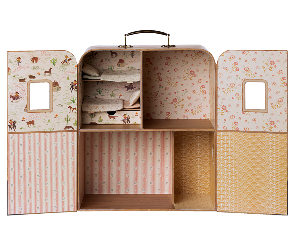Bienvenido a SuitCasa, una encantadora casita portátil para ratones, del tamaño perfecto para los ratoncitos Little Brother y Little Sister. Con una práctica asa, se transforma en una maleta al cerrar las puertas magnéticas, facilitando que tus ratoncitos se vayan de aventuras. En su interior, dos camas integradas con ropa de cama suave les brindan un lugar acogedor para dormir, y hay espacio suficiente para añadir pequeños muebles y accesorios a su medida y crear un hogar personalizado y confortable para llevar a todas partes.