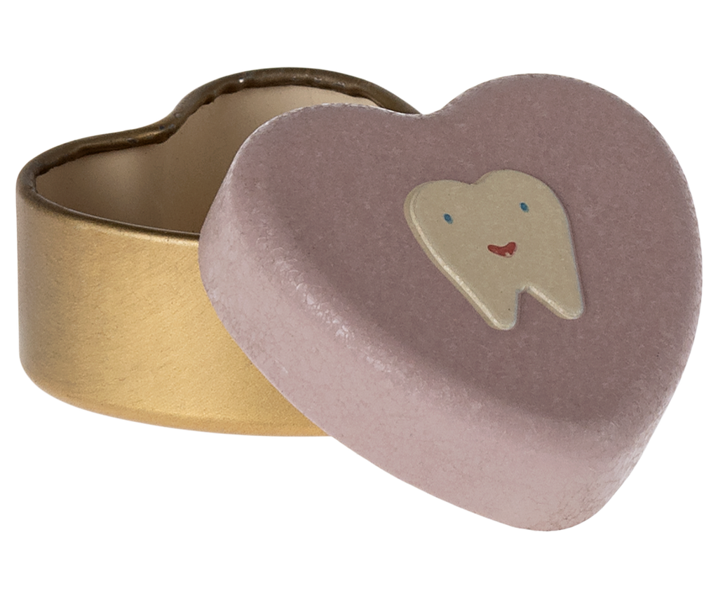 Este pequeño corazón de metal es el lugar perfecto para almacenar dientes pequeños y así garantizar que los recuerdos de la infancia perduren. La caja tiene un precioso relieve dental y una superficie alegremente decorada en la tapa.