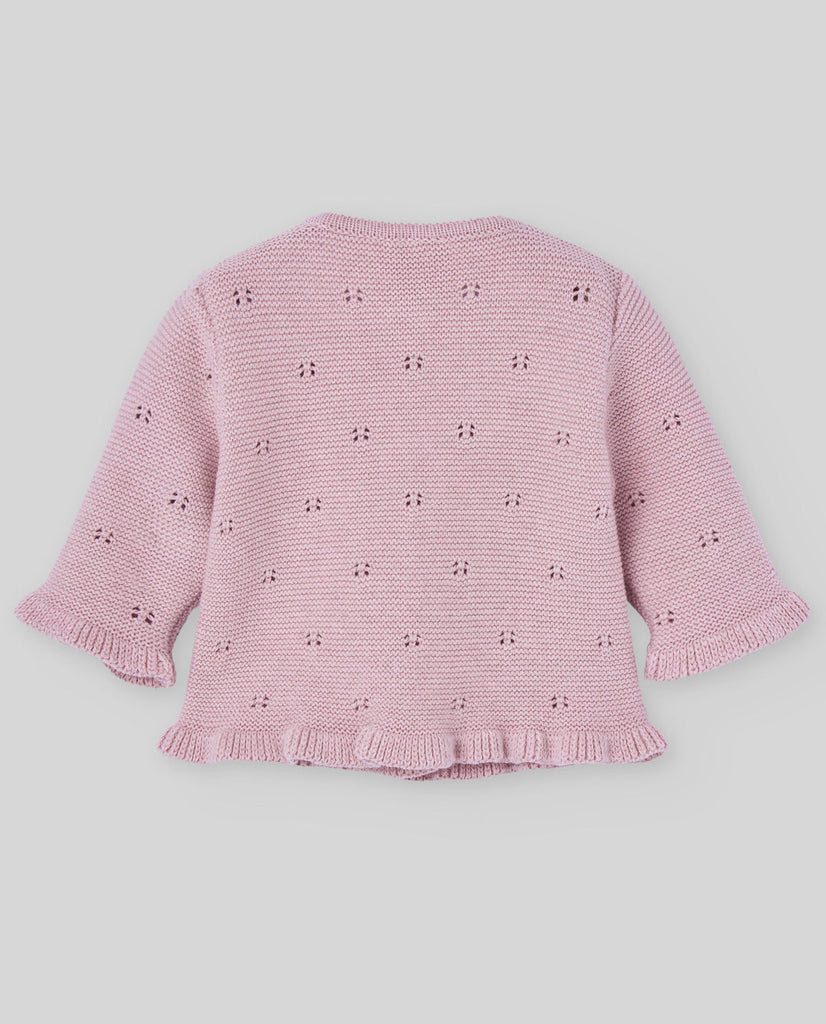 Chaqueta de punto larga para niña, confeccionada en punto fantasía con textura suave y cuerpo cálido.