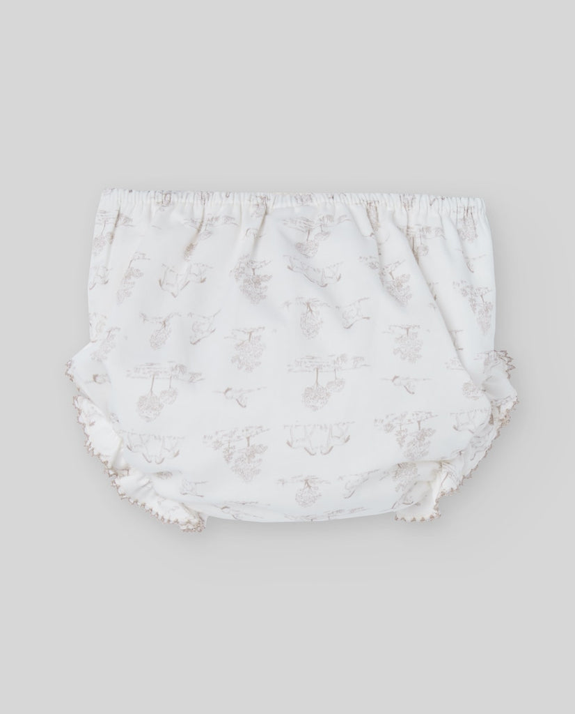 Braga de plumeti con textura delicada y diseño abullonado. El fruncido en cintura y piernas ofrece un ajuste cómodo con un acabado muy decorativo.
