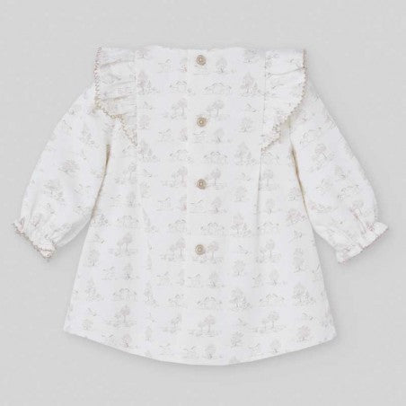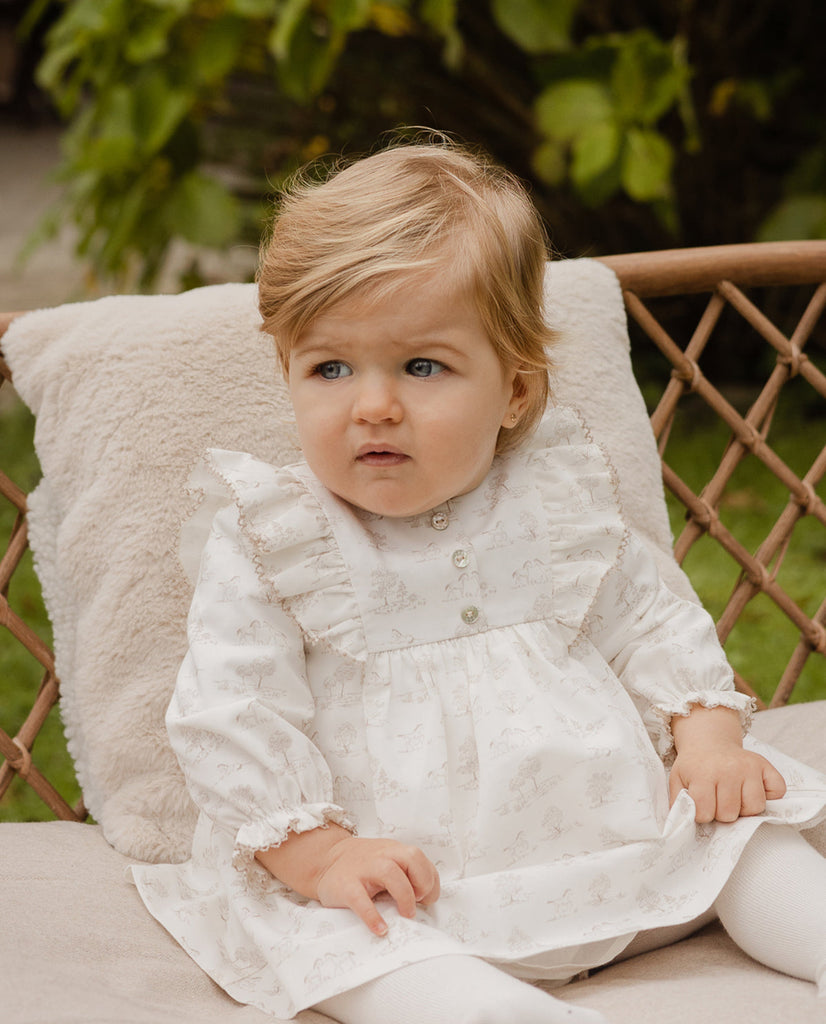 Vestido en plumeti con cuello babero y puntilla decorativa. Mangas largas fruncidas y lazo en el delantero. Corte clásico y cierre trasero con botones.