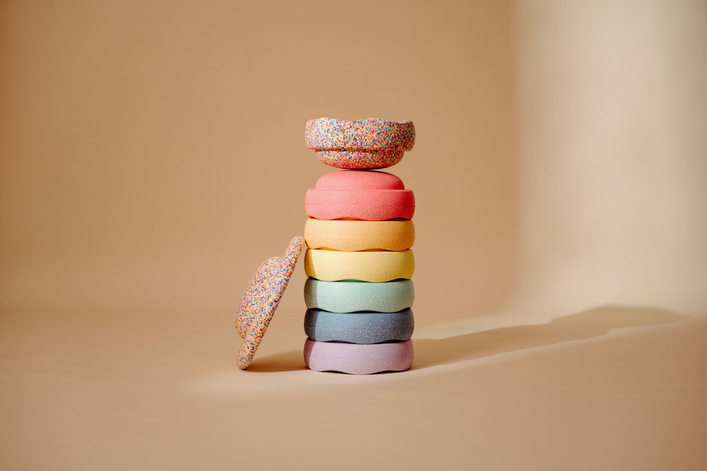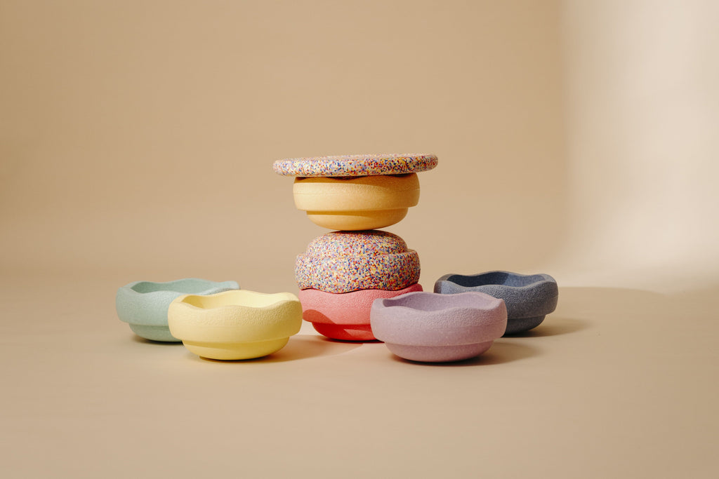 - Si deseas usar los productos Stapelstein para juegos de equilibrio y circuitos, se recomienda hacerlo sobre una superficie nivelada y antideslizante. Apila los elementos Stapelstein solo hasta una altura en la que te sientas seguro. Recomendamos apilar un máximo de 3 elementos si planeas escalar una torre caminando.