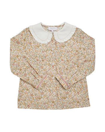 Esta sofisticada y exclusiva blusa, confeccionada en suntuoso algodón con un estampado floral rosa caqui, es una prenda imprescindible para el armario invernal de tu hija. Con un delicado cuello Peter Pan con intrincados bordados rosa claro, puños de terciopelo rosa suave y botones de nácar en la parte delantera, irradia una elegancia atemporal. Versátil y natural, combina a la perfección con las faldas o shorts de Amaia y sus accesorios a juego para un conjunto impecable. Ya sea para un evento especial o para el día a día, esta exquisita blusa ofrece comodidad y refinamiento, convirtiéndola en una prenda esencial para la temporada.