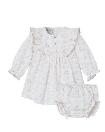 Vestido en plumeti con cuello babero y puntilla decorativa. Mangas largas fruncidas y lazo en el delantero. Corte clásico y cierre trasero con botones.