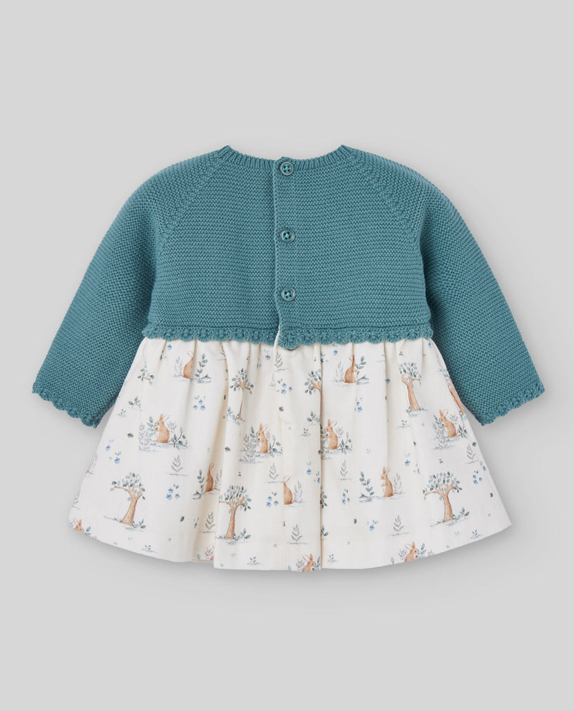 Vestido de manga larga con cuerpo de punto bobo y falda de tela estampada con motivos de bosque. Su diseño combina calidez y fantasía para ocasiones especiales o looks diarios con encanto.