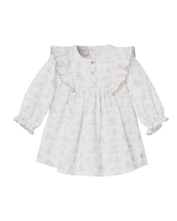 Vestido en plumeti con cuello babero y puntilla decorativa. Mangas largas fruncidas y lazo en el delantero. Corte clásico y cierre trasero con botones.